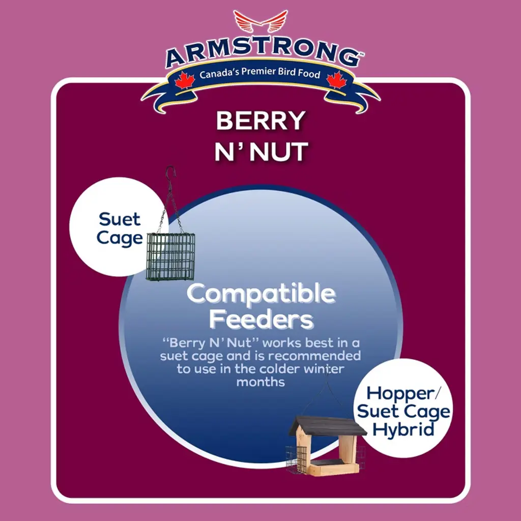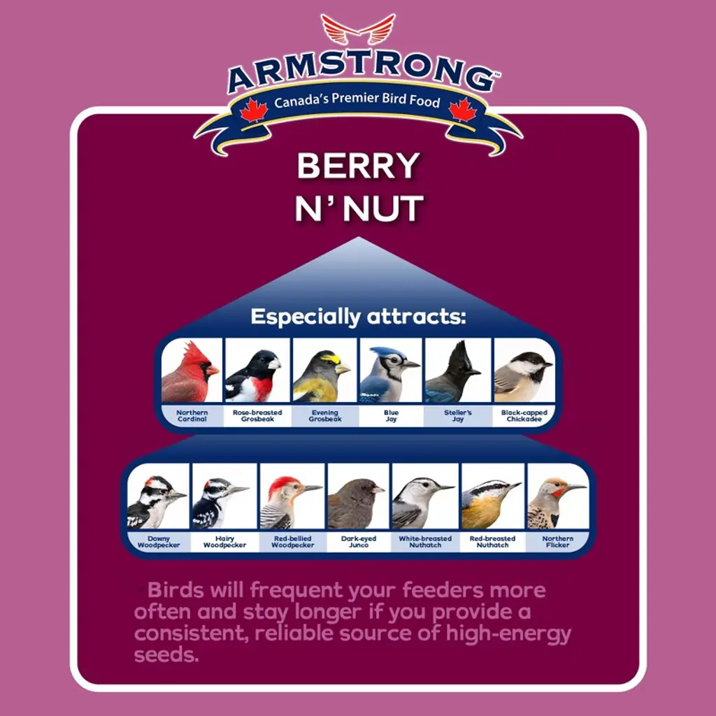 Attracts: Northern Cardinals, Rose-breasted Grosbeaks, Evening Grosbeaks, Blue Jays, Steller’s Jays, Black-capped Chickadees, Downy Woodpeckers, Hairy Woodpeckers, Red-bellied Woodpeckers, Dark-eyed Juncos, White-breasted Nuthatches, Red-breasted Nuthatches, and Northern Flickers. Birds will frequent your feeders more often and stay longer if you provide a consistent, reliable source of high-energy blends from Armstrong.