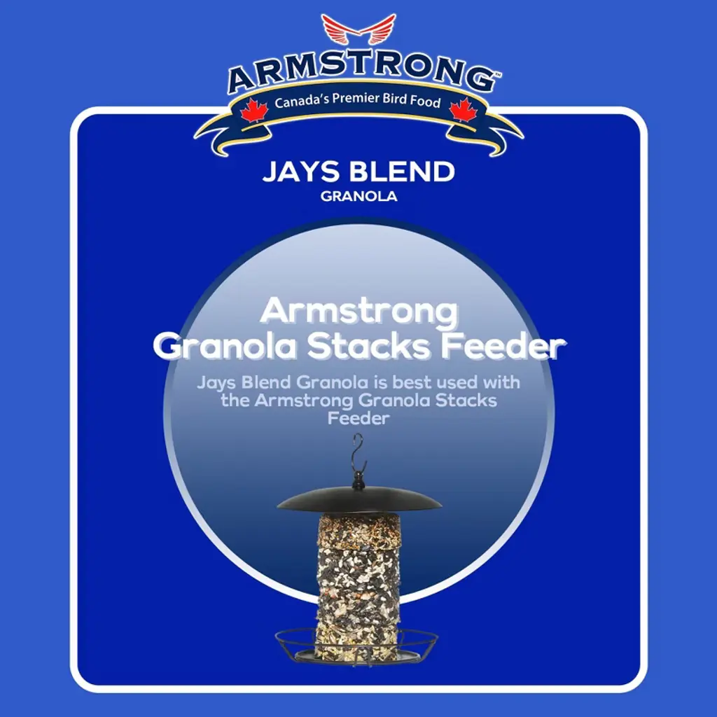 The Armstrong Royal Jubilee Jays Blend Granola Stack is a premium wild bird food specially crafted to attract Blue Jays, Steller’s Jays, Gray Jays, Canada Jays, and other backyard favorites. Packed with high-energy, nutrient-rich ingredients, including whole corn, striped sunflower seeds, black oil sunflower seeds, peanuts, and natural gelatin, this protein-packed, mess-free seed stack provides essential nutrition to support wild birds year-round. Simply unwrap and place it in a feeder for an easy, no-mess feeding solution. For the best experience, pair it with the Armstrong Royal Jubilee Granola Stack Feeder (sold separately). Ideal for birdwatchers, nature lovers, and outdoor enthusiasts, this premium granola stack encourages more frequent visits from wild birds, keeping them happy, healthy, and energized. Birds will frequent your feeders more often and stay longer if you provide a consistent, reliable source of high-energy treats from Armstrong.