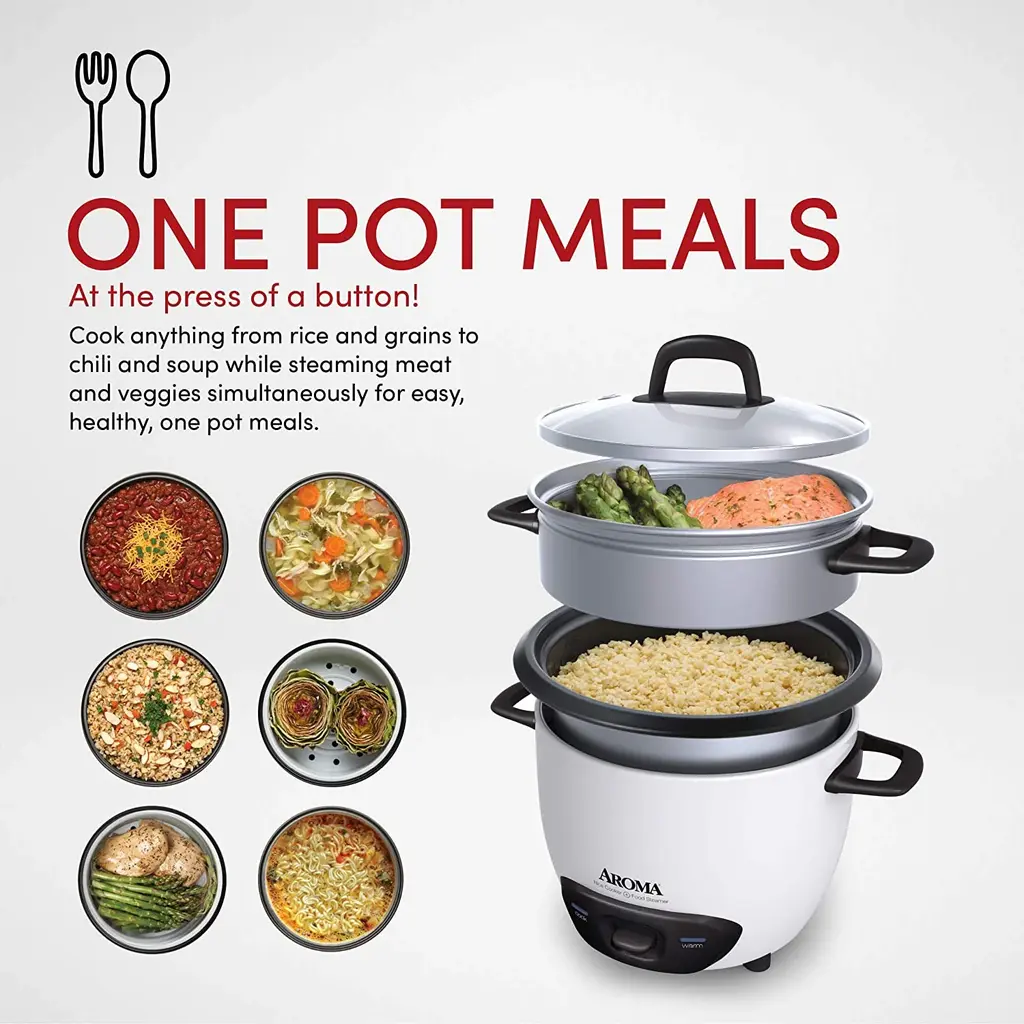 Description: Enjoy easy home cooking with the Aroma 6-Cup (Cooked) Pot Style Rice Cooker and Food Steamer. Restaurant-quality rice. Healthy steamed meals. Delicious one-pot dishes. Prepare all this and more at the flip of a switch! Aroma takes the 'cook' out of home cooking turning kitchen time into your time. Help the kids with homework, get creative at play time or pick up that novel you've been waiting to dive into. All while delivering hot, hearty and healthy meals the entire family will love Features: Simple One-Touch Design Steam Technology Meal Versatility Everything You Could Need Additional Features: What is Factory Remanufactured?When a product is Factory Remanufactured, it is tested and checked to operate as a brand new item should. Many times it is as simple as the box being opened by mistake or for quality checks. Once the box has been opened companies cannot legally sell these items as New. Each item is inspected, rerun down the production line and triple checked for quality before being shipped. We are so confident with the quality of our Factory Remanufactured items that we offer a 60 day return policy with every purchase, so buy with confidence!