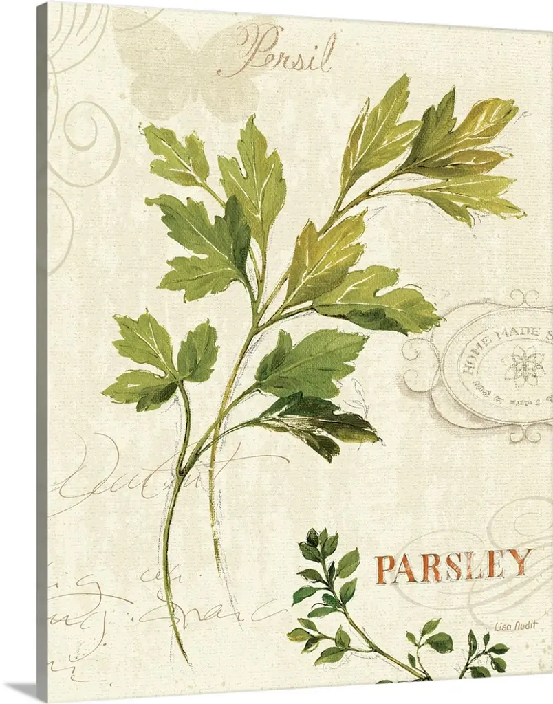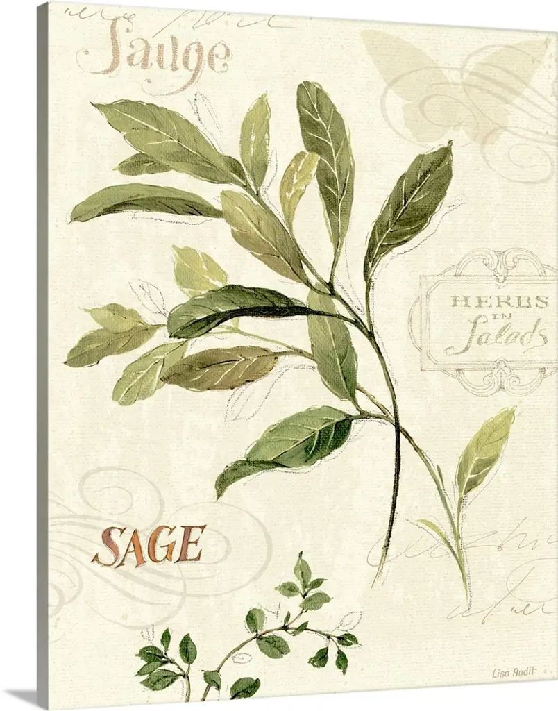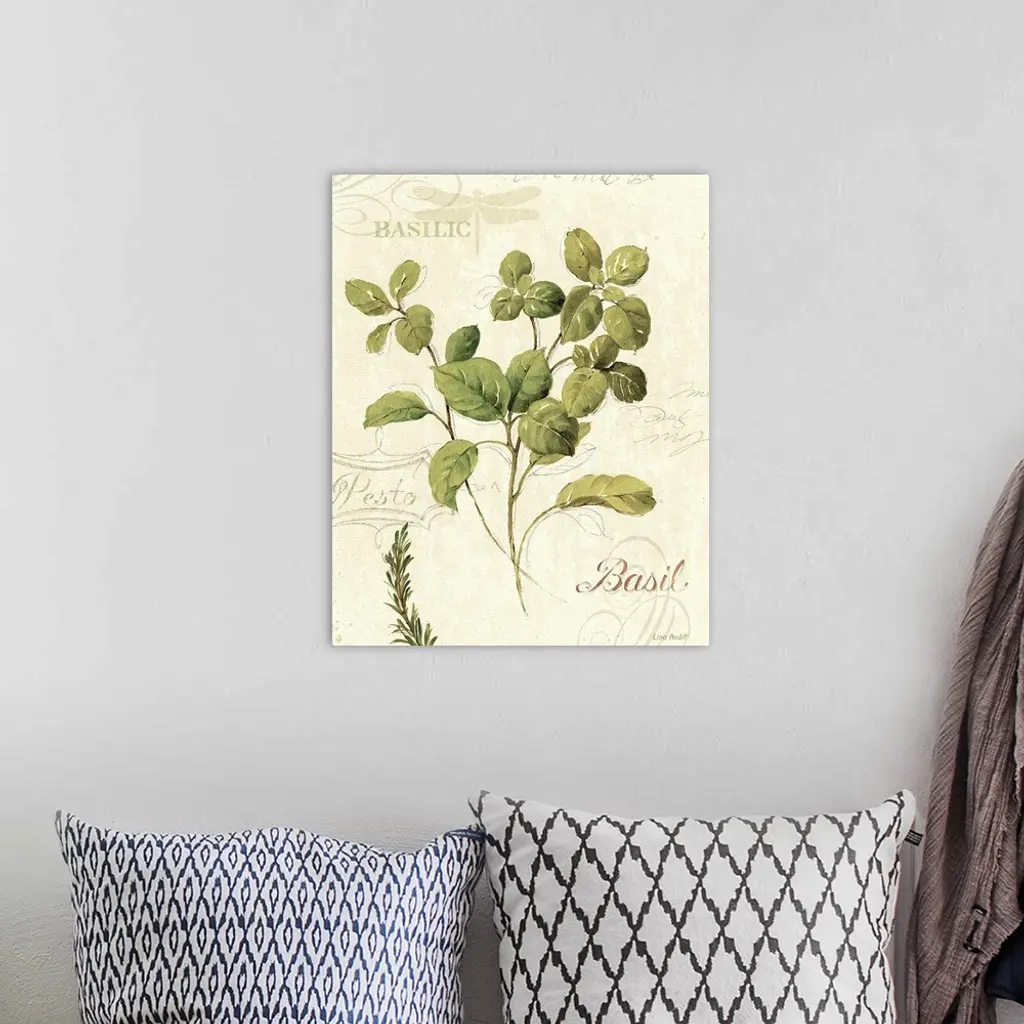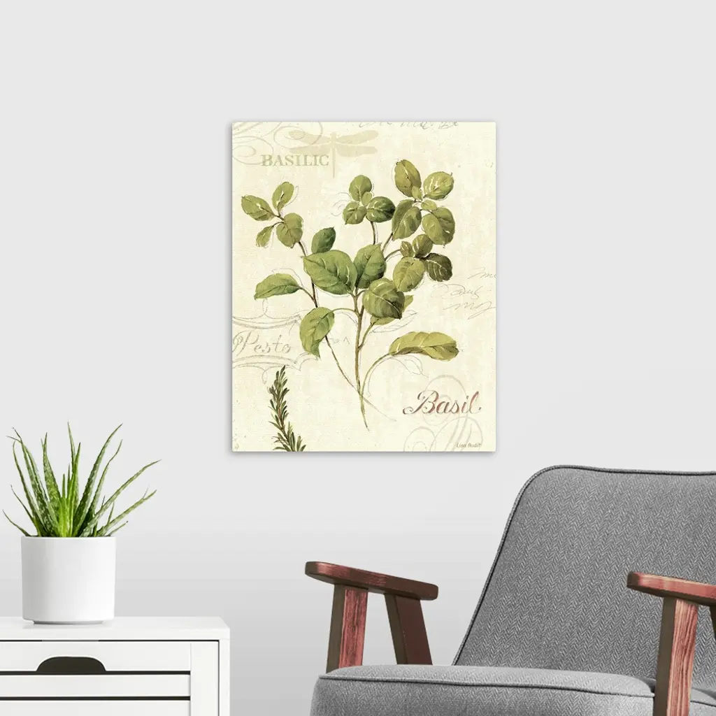 Watercolor print of a few sprigs of a basil herb on a background decorated with text and flourishes.