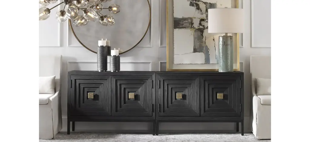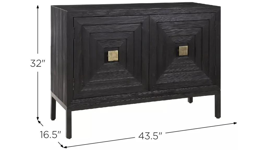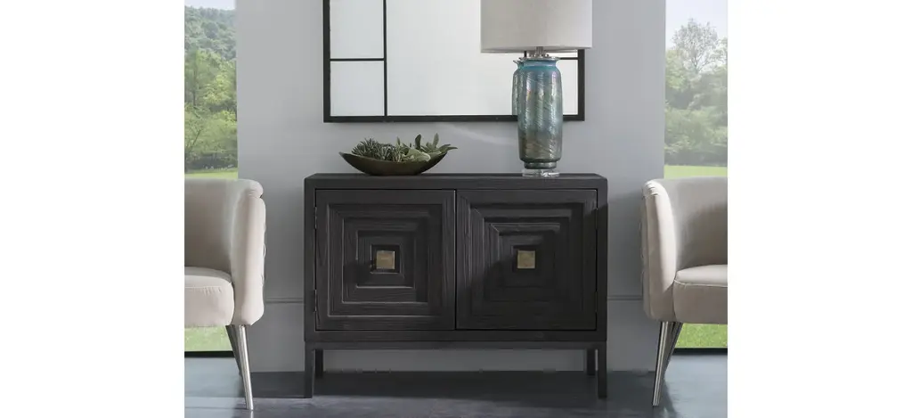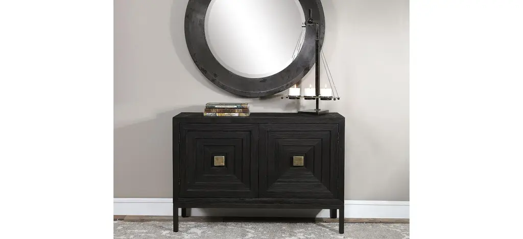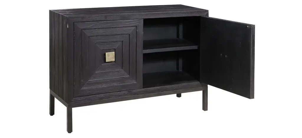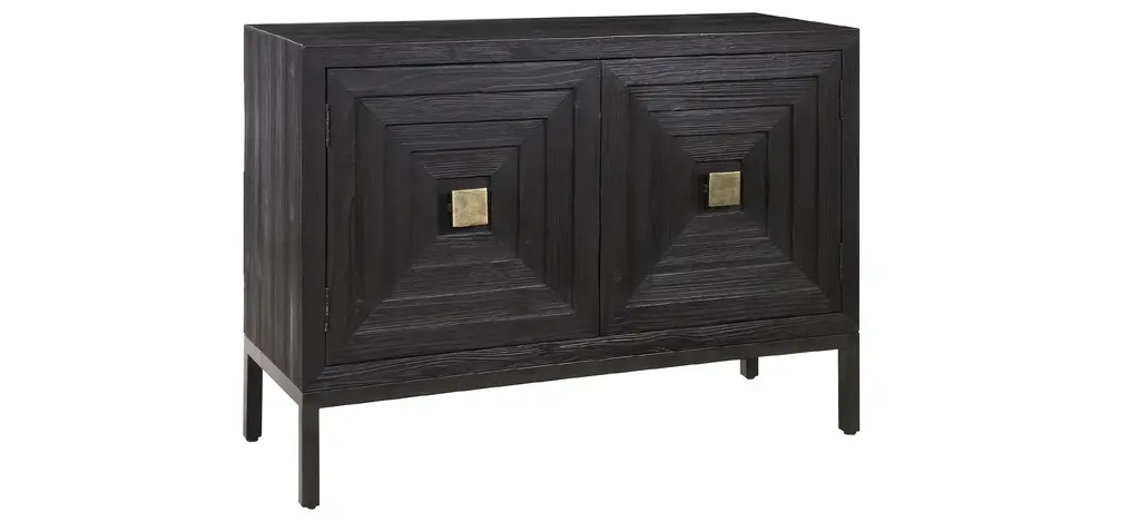 A contemporary geometric two door Arrowsic Cabinet, constructed from deeply grained fir wood finished in a dark ebony stain, accented with brushed brass hardware. It has one fixed interior shelf.