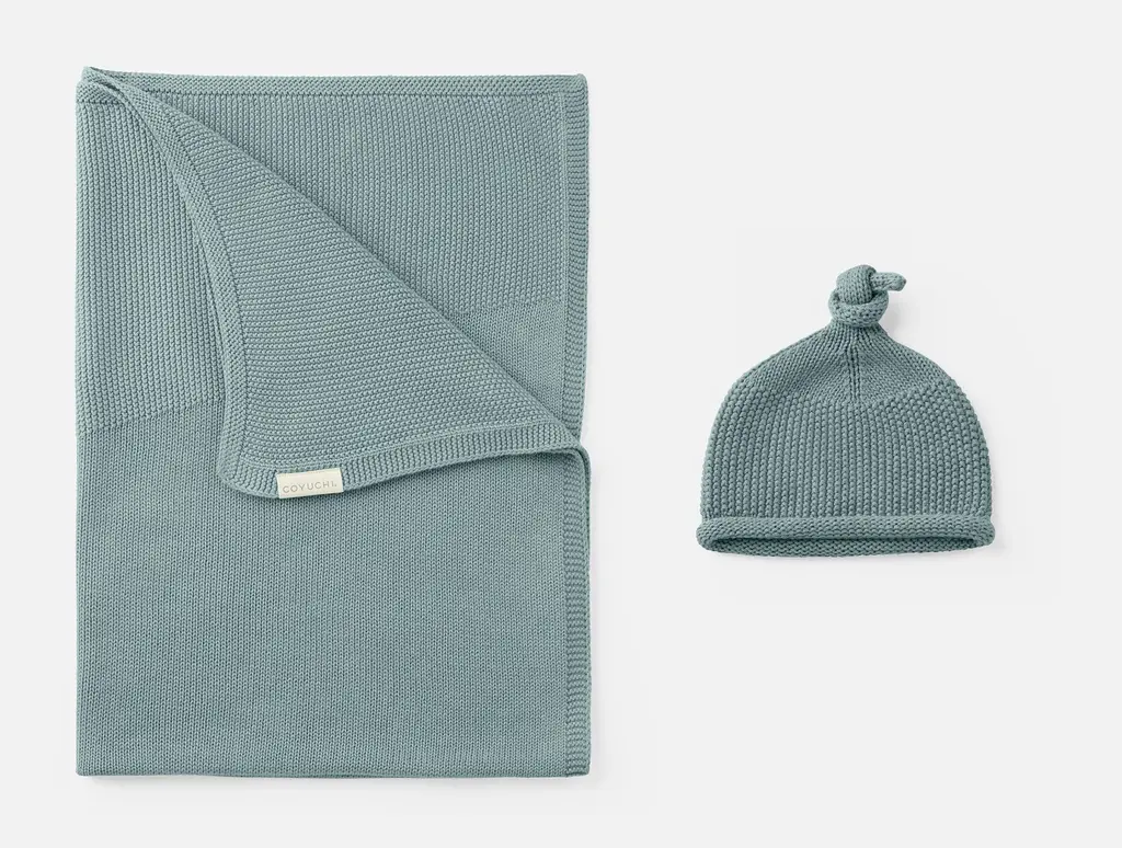 The Arroyo Organic Knit Baby Gift Set includes a beautifully textured baby blanket and matching beanie, both crafted from soft organic cotton to keep little ones cozy. The blanket features a chunky, touchable knit that babies love, finished with stitched edges that prevent curling. The matching beanie, with a charming top knot and rolled hem, brings extra warmth and comfort. Gentle on delicate skin and thoughtfully designed, this set makes a perfect, practical gift for any nursery.