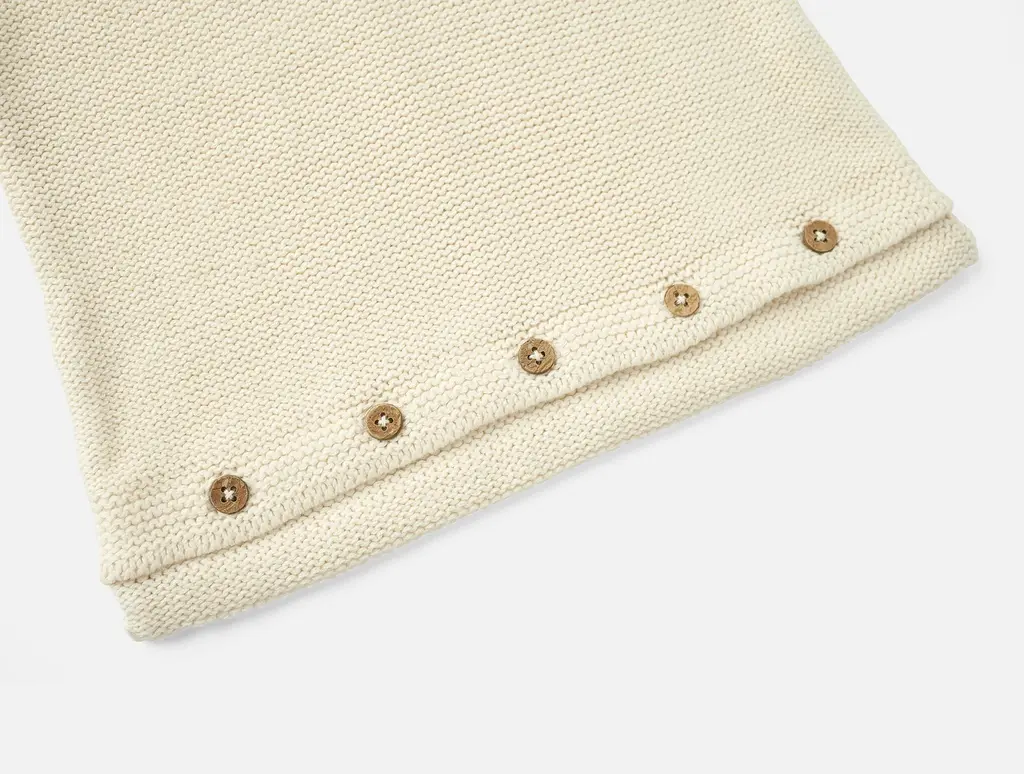 Soft, cozy, and gentle against baby’s skin, this textured organic cotton snuggle sack will keep little ones comfy. Soft organic yarns create subtle variations of texture with a mix of reverse jersey and seed stitch. A placket of four coconut shell buttons opens down the front, with a matching placket of five buttons along the bottom for easy access from multiple angles. An attached hood tops off all that coziness with an oversized tassel, making for a one-of-a-kind, organic baby gift.