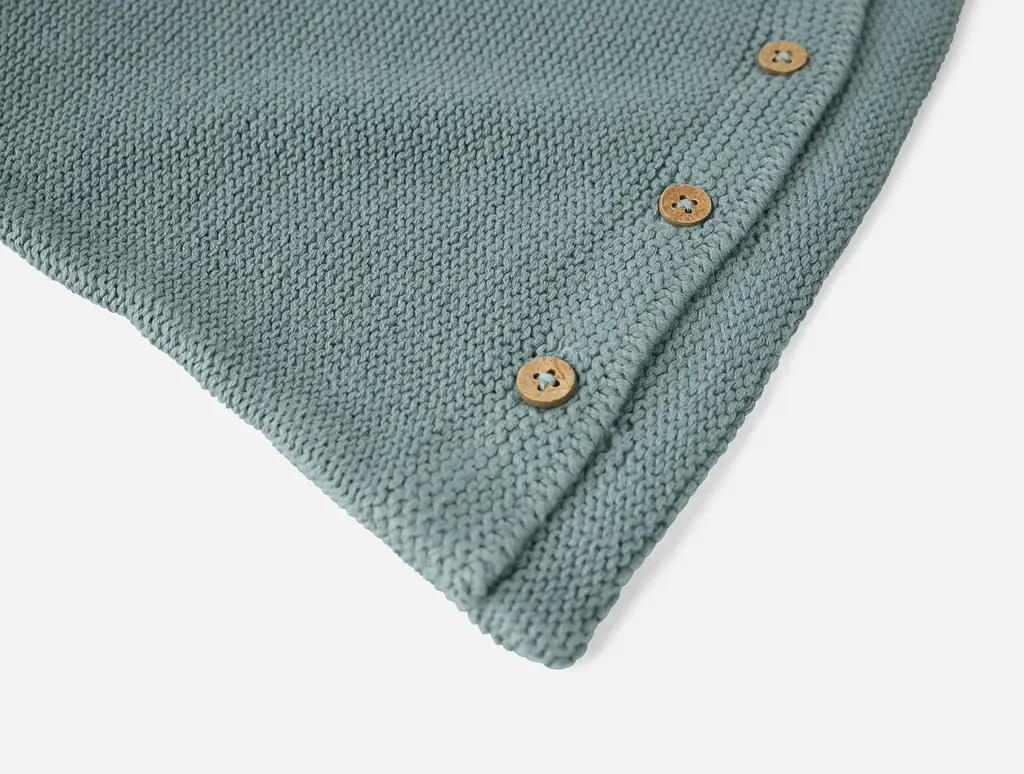 Soft, cozy, and gentle against baby’s skin, this textured organic cotton snuggle sack will keep little ones comfy. Soft organic yarns create subtle variations of texture with a mix of reverse jersey and seed stitch. A placket of four coconut shell buttons opens down the front, with a matching placket of five buttons along the bottom for easy access from multiple angles. An attached hood tops off all that coziness with an oversized tassel, making for a one-of-a-kind, organic baby gift.