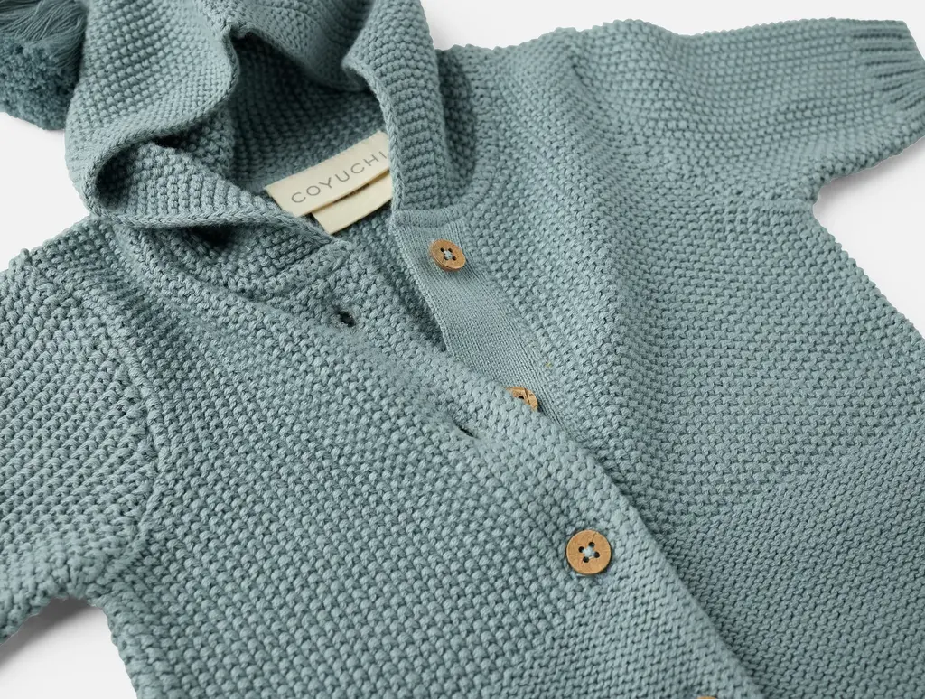 Soft, cozy, and gentle against baby’s skin, this textured organic cotton snuggle sack will keep little ones comfy. Soft organic yarns create subtle variations of texture with a mix of reverse jersey and seed stitch. A placket of four coconut shell buttons opens down the front, with a matching placket of five buttons along the bottom for easy access from multiple angles. An attached hood tops off all that coziness with an oversized tassel, making for a one-of-a-kind, organic baby gift.