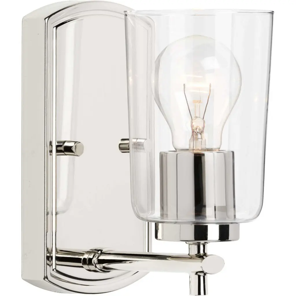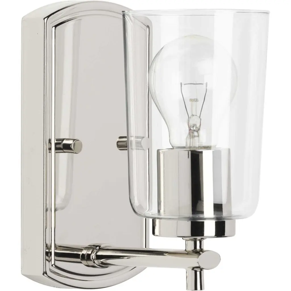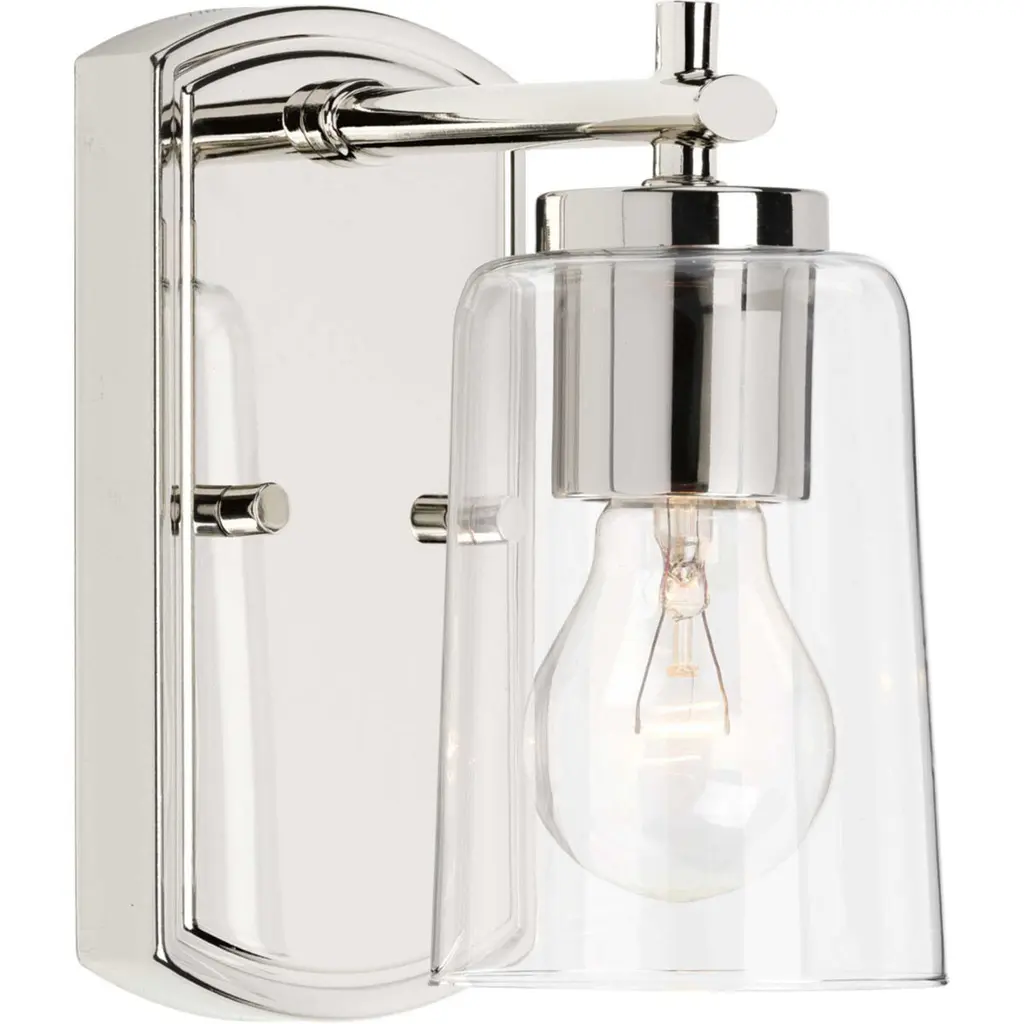 Create a haven for relaxation and revival with the Art one-light bath. This fixture features a Polished Nickel, curved backplate attached to a simple, clear glass shade. The modern piece is perfect for adding ambient light to bathroom and vanity settings in traditional and transitional interiors.