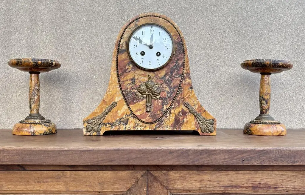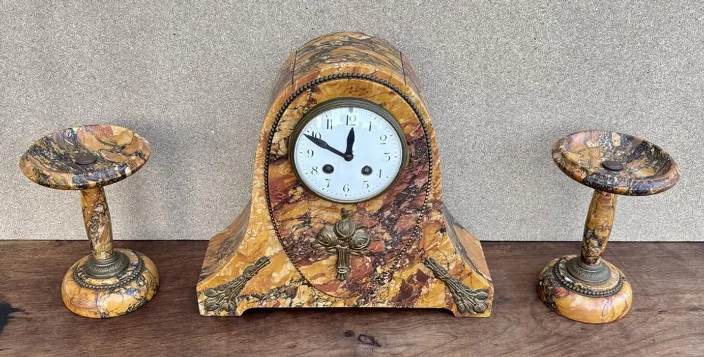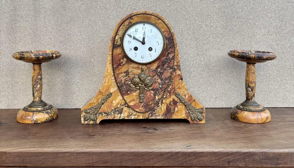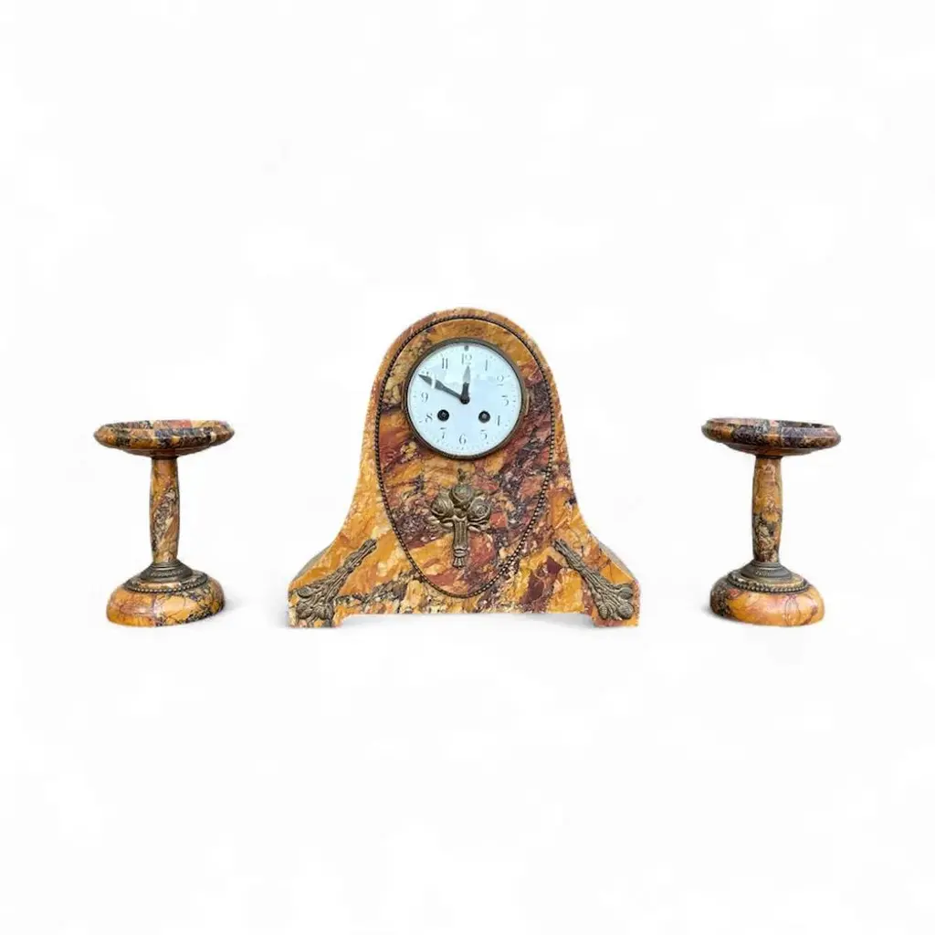 Art Deco Clock With Marble Trim, 1890s, Set Of 3