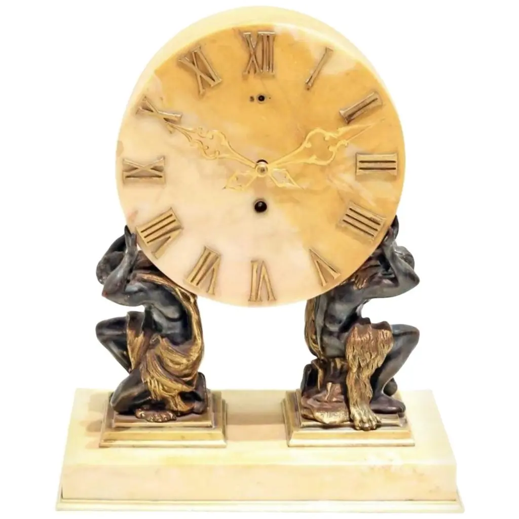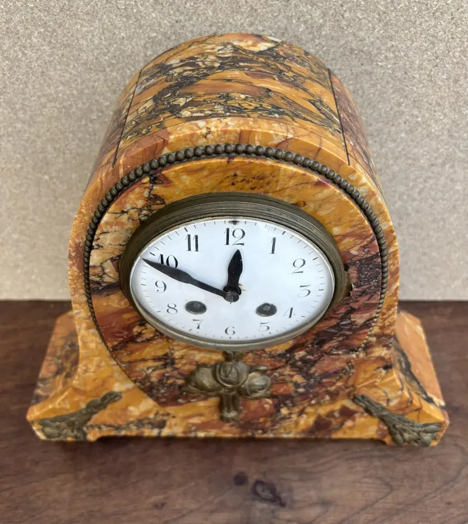Classic french mantel clock from the early 20th century, manufactured by the prestigious société clusienne in cluses, the birthplace of high-quality watchmaking. Mounted on a veined orange marble base and featuring the same marble inserts enhanced with delicate bronze details, this mechanical clock combines refined design and exceptional craftsmanship. Its dial with classic numerals, delicate hands, and the original signature on the movement reflect authentic period watchmaking. Perfect for collectors and for adding a touch of timeless luxury to any setting. Trim dimensions: h 19cm, w 13.5cm, d 13.5cm this piece has an attribution mark, i am sure that it is completely authentic and take full responsibility for any authenticity issues arising from misattribution