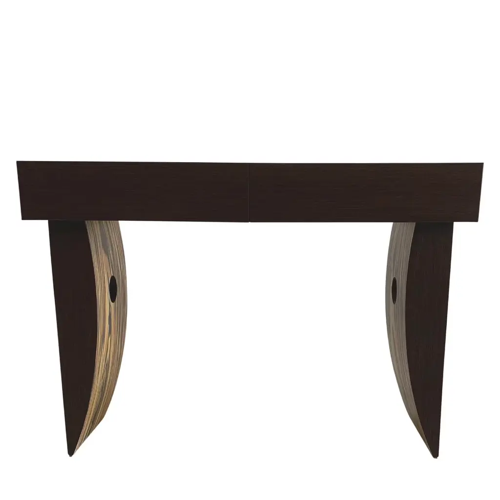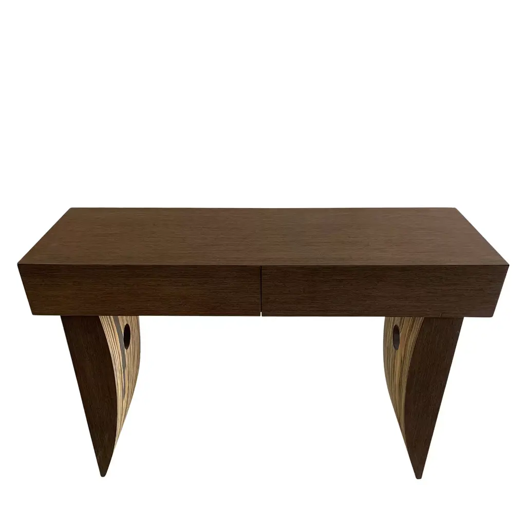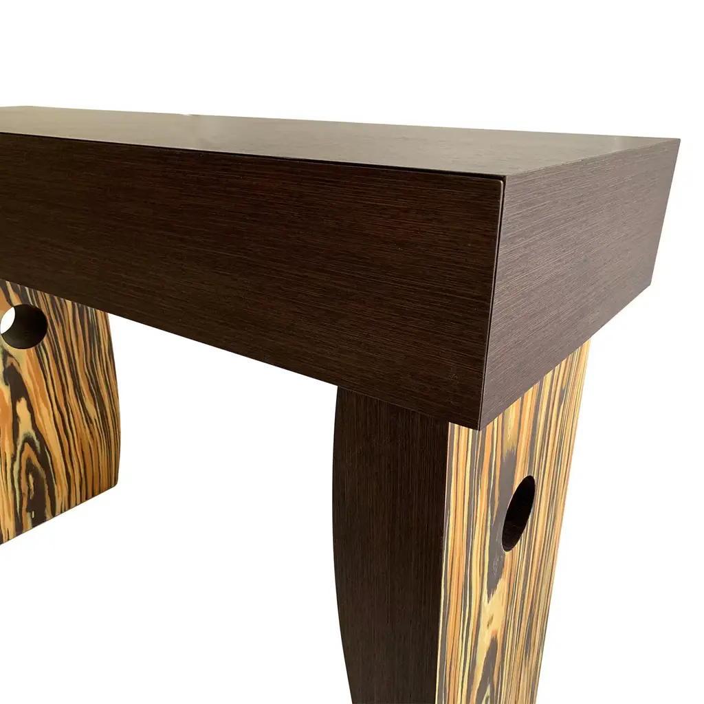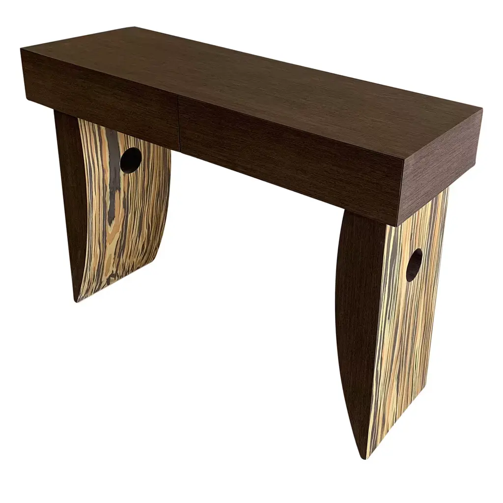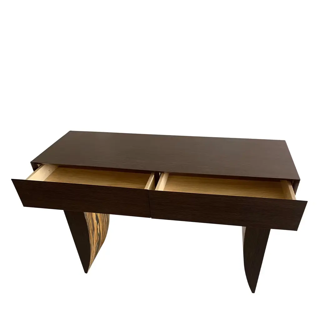 A testament to refined craftsmanship, this splendid wooden console belongs to an exclusive two-piece series created for an Italian Design contest. Resting on striking legs showcasing a saber shape and enhanced with a flame-like veneering, it features a sturdy rectangular top with two drawers, finished in a timeless dark brown hue. Exuding a lightweight structure with Art Deco charm, it will effortlessly adorn both a contemporary or classic entryway.
