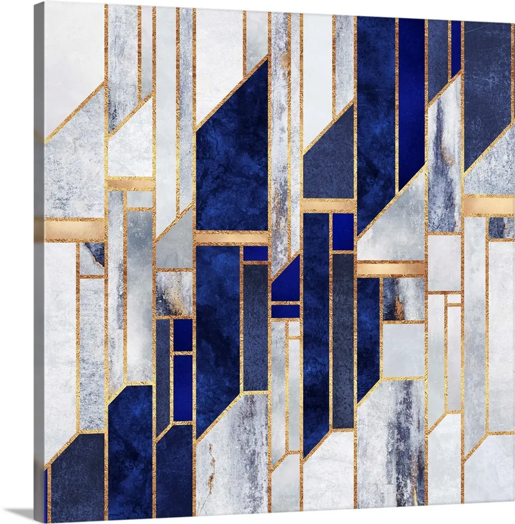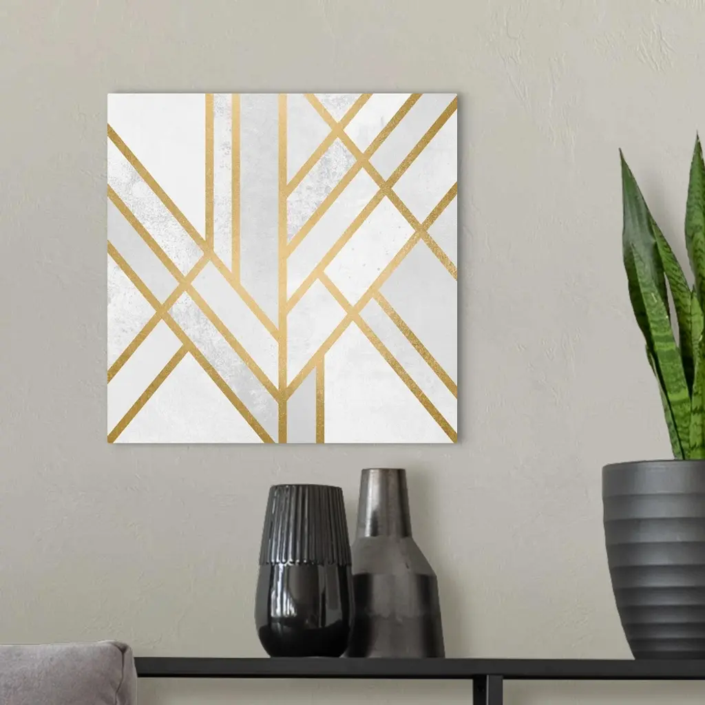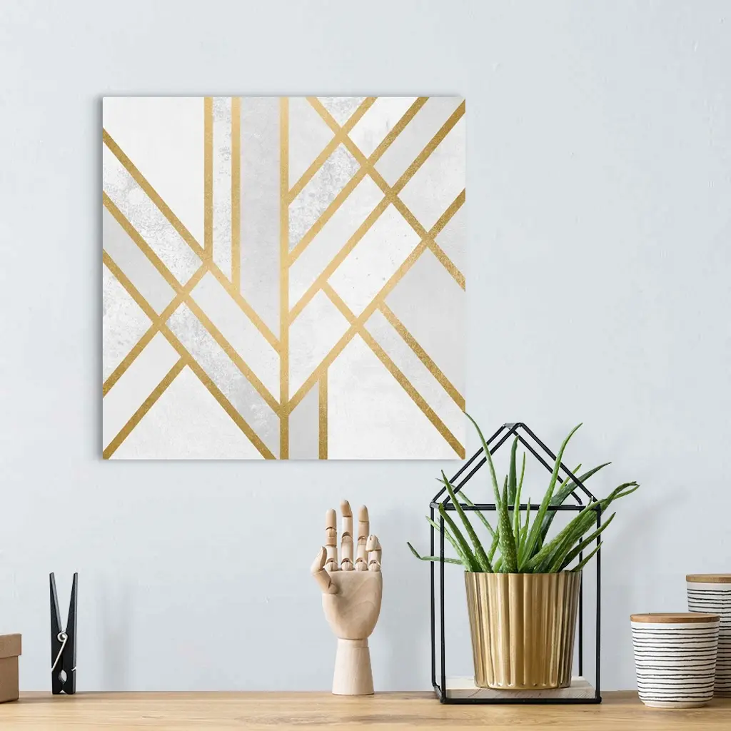 A simple art deco design in gold lines on a cream and marbled pale grey background