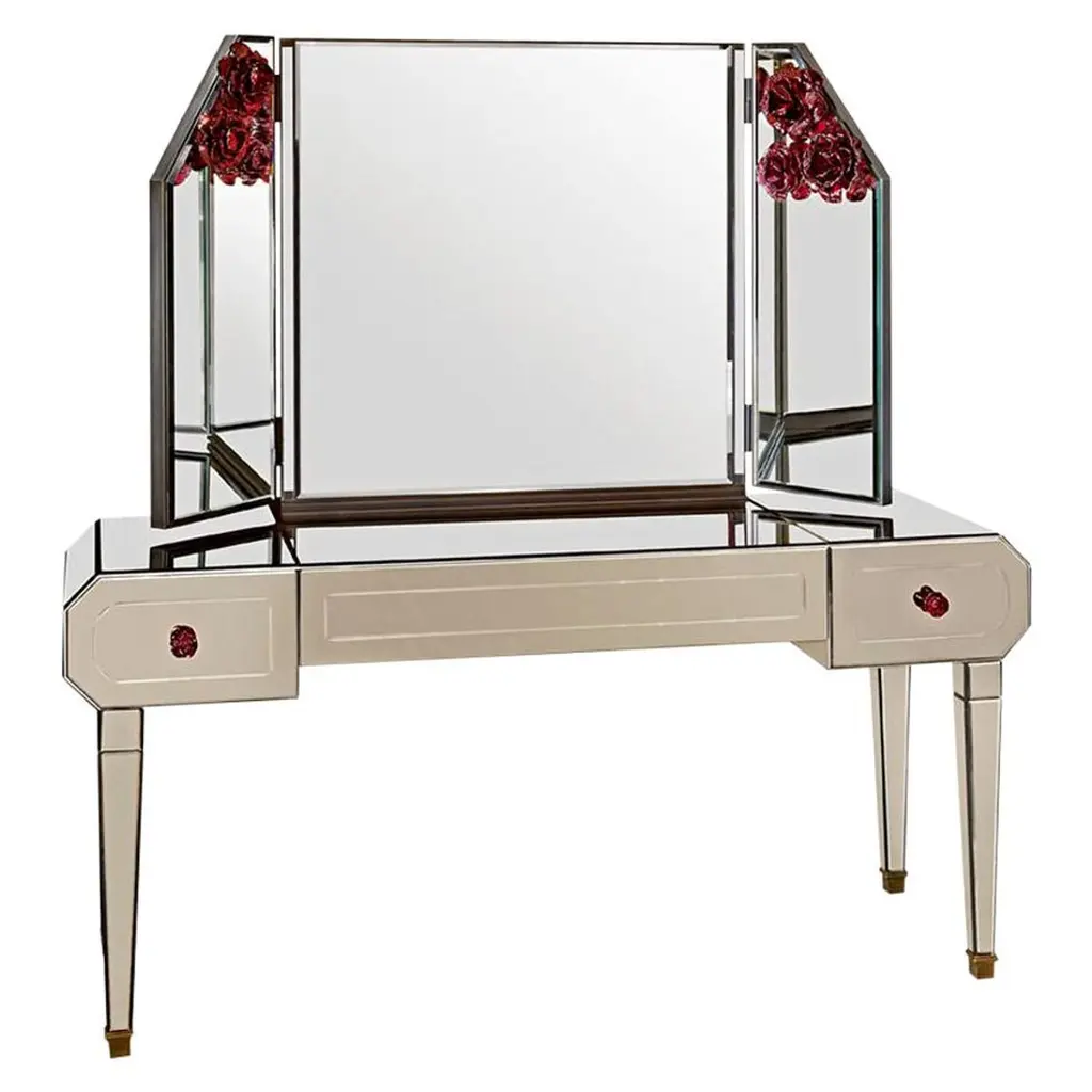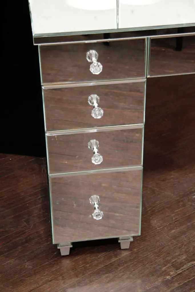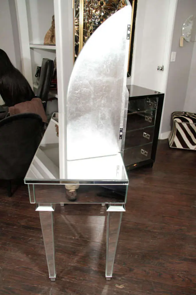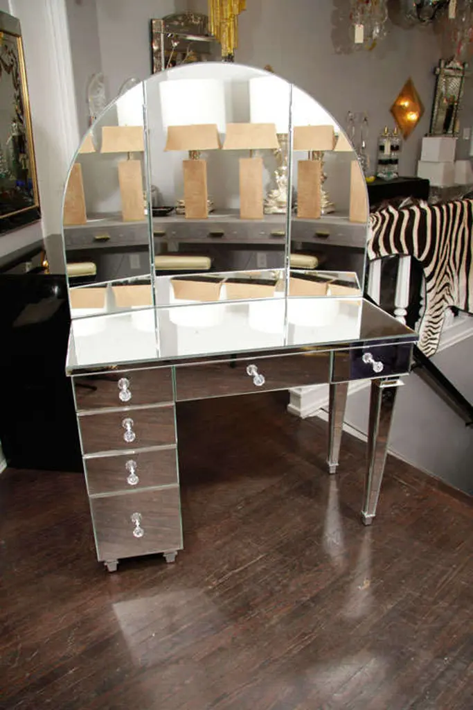 Art Deco style mirrored vanity with triptych mirror.Currently out of stock but available for custom order in different sizes and colors. Please inquire about estimated production lead times.