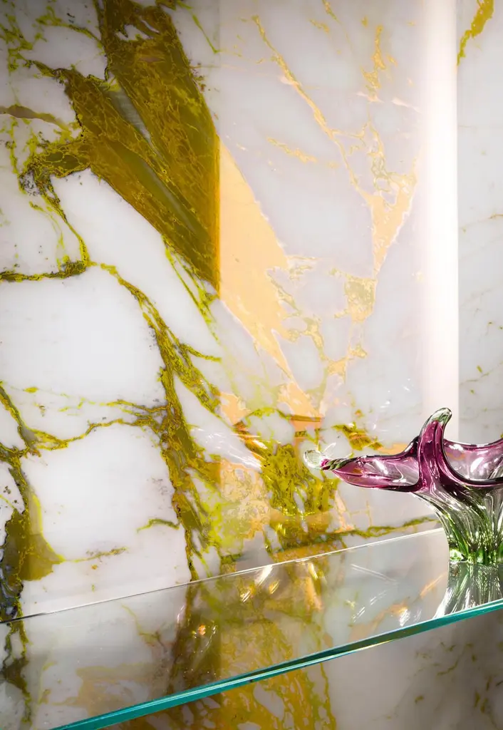 A combination of special techniques and process has created glass sheets that capture the timeless and limitless beauty of precious stones, lava rock, as well as dream landscape.Thirteen unique looks, with swirling veins or slight ripples, transparent and opaque. All option are available in different finishes and back-groundsSolid version in which the patterning and colors are saturated on a pure white baseChromo, mirror and chrome-plated effect reflecting the brilliant colors.Opalescent, has translucent effect and will reflect the colors based on the texture. These can be backlitGem glass has a strong aesthetic character and thanks to the special processing, suitable for multiple uses, application and interpretations. Gem glass can be straight or wavy.