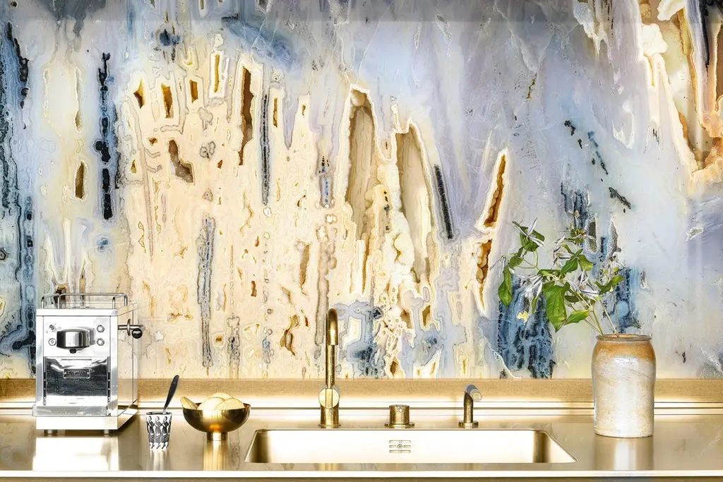 A combination of special techniques and process has created glass sheets that capture the timeless and limitless beauty of precious stones, lava rock, as well as dream landscape.Thirteen unique looks, with swirling veins or slight ripples, transparent and opaque. All option are available in different finishes and back-groundsSolid version in which the patterning and colors are saturated on a pure white baseChromo, mirror and chrome-plated effect reflecting the brilliant colors.Opalescent, has translucent effect and will reflect the colors based on the texture. These can be backlitGem glass has a strong aesthetic character and thanks to the special processing, suitable for multiple uses, application and interpretations. Gem glass can be straight or wavy.
