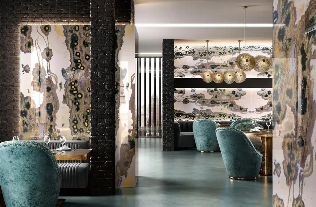 A combination of special techniques and process has created glass sheets that capture the timeless and limitless beauty of precious stones, lava rock, as well as dream landscape.Thirteen unique looks, with swirling veins or slight ripples, transparent and opaque. All option are available in different finishes and back-groundsSolid version in which the patterning and colors are saturated on a pure white baseChromo, mirror and chrome-plated effect reflecting the brilliant colors.Opalescent, has translucent effect and will reflect the colors based on the texture. These can be backlitGem glass has a strong aesthetic character and thanks to the special processing, suitable for multiple uses, application and interpretations. Gem glass can be straight or wavy.
