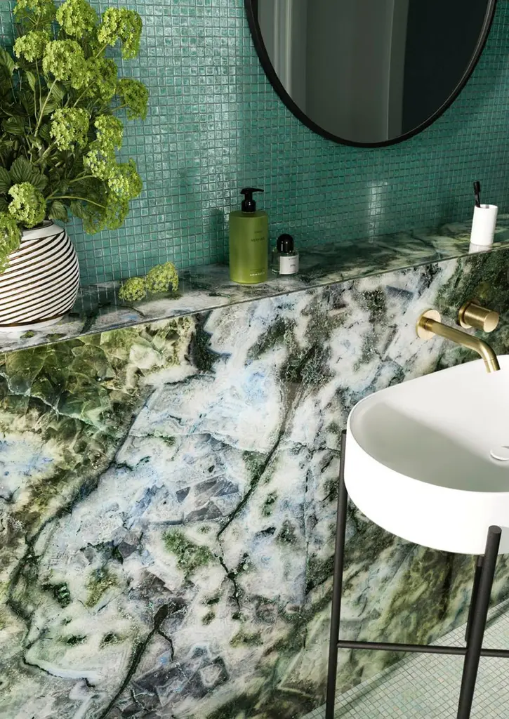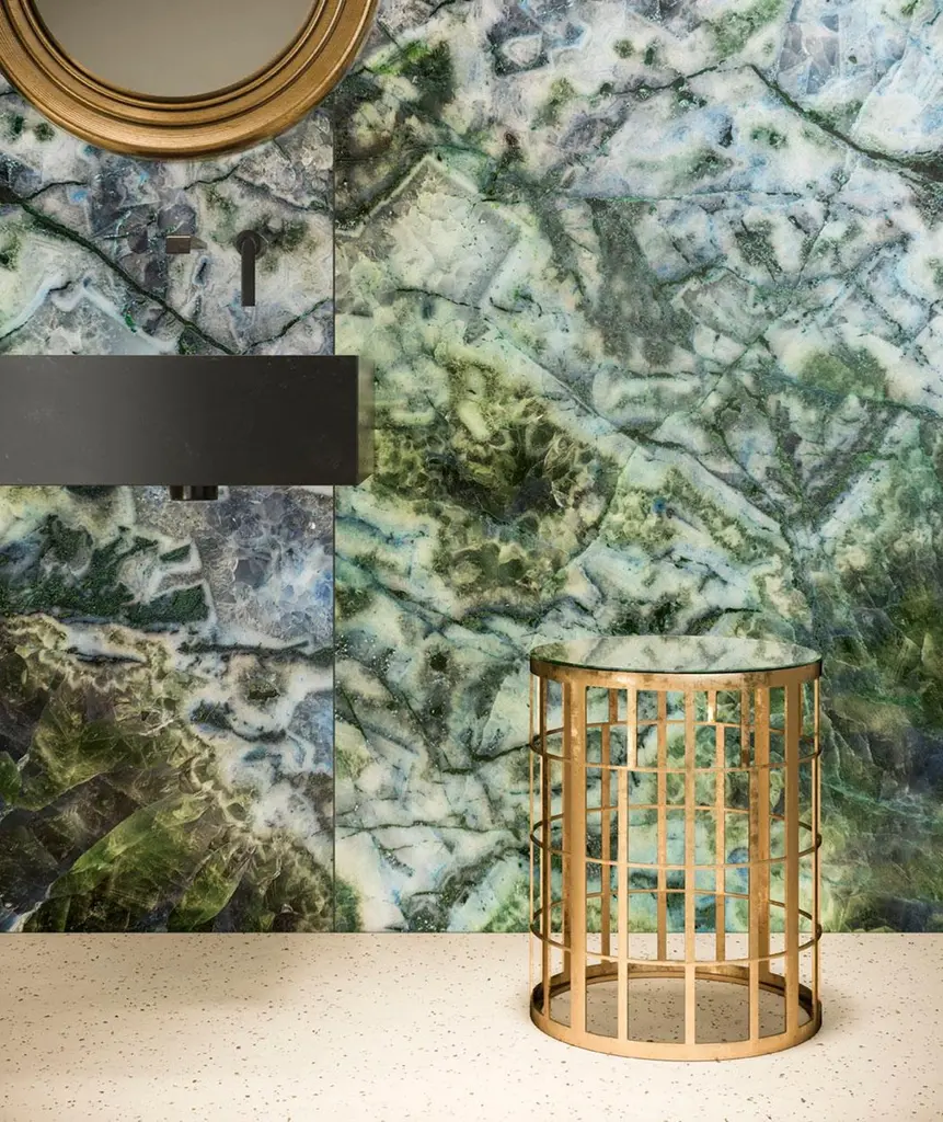 A combination of special techniques and process has created glass sheets that capture the timeless and limitless beauty of precious stones, lava rock, as well as dream landscape.Thirteen unique looks, with swirling veins or slight ripples, transparent and opaque. All option are available in different finishes and back-groundsSolid version in which the patterning and colors are saturated on a pure white baseChromo, mirror and chrome plated effect reflecting the brilliant colors.Opalescent, has translucent effect and will reflect the colors based on the texture. These can be backlitGem Glass has a strong aesthetic character and thanks to the special processing, suitable for multiple uses, application and interpretations. Gem Glass can be straight or wavy.