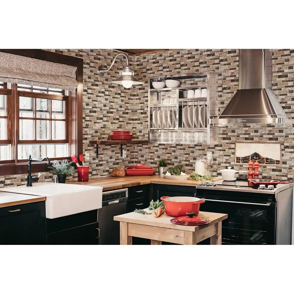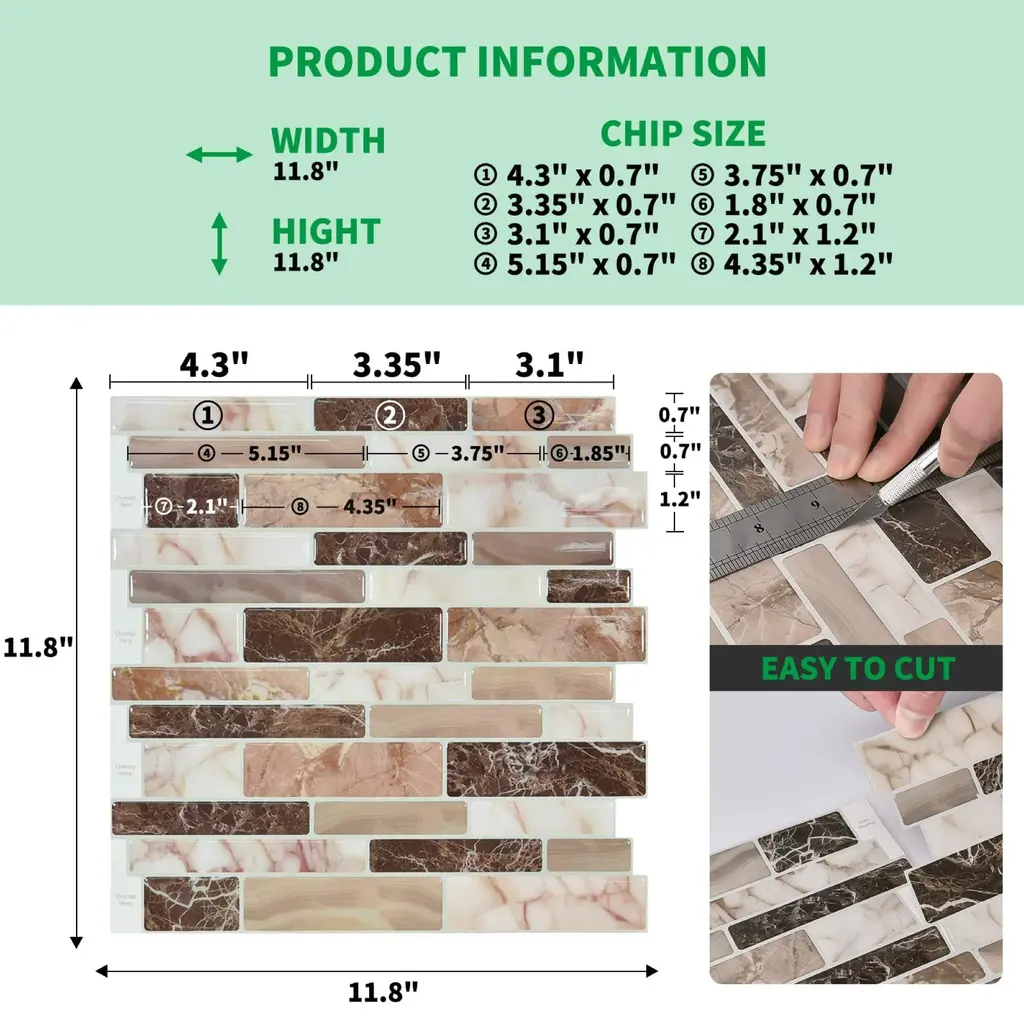 Transform your living space with Art3d's Brown Marble Mix Peel and Stick Backsplash Tiles. These tiles are a game-changer, adding a special and graceful style to your walls. Enjoy easy and do-it-yourself installation directly over existing panels or smooth surfaces. Resistant to heat and moisture, these tiles are easy to wipe clean, making them a practical and stylish addition to your kitchen, bathroom, bedroom, or laundry room. Each pack includes 10 self-adhesive backsplash tiles sized at 12"x12".Features:Please note: