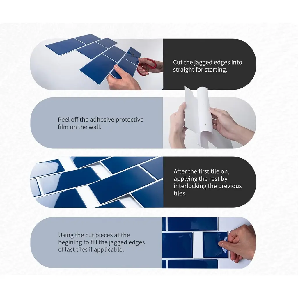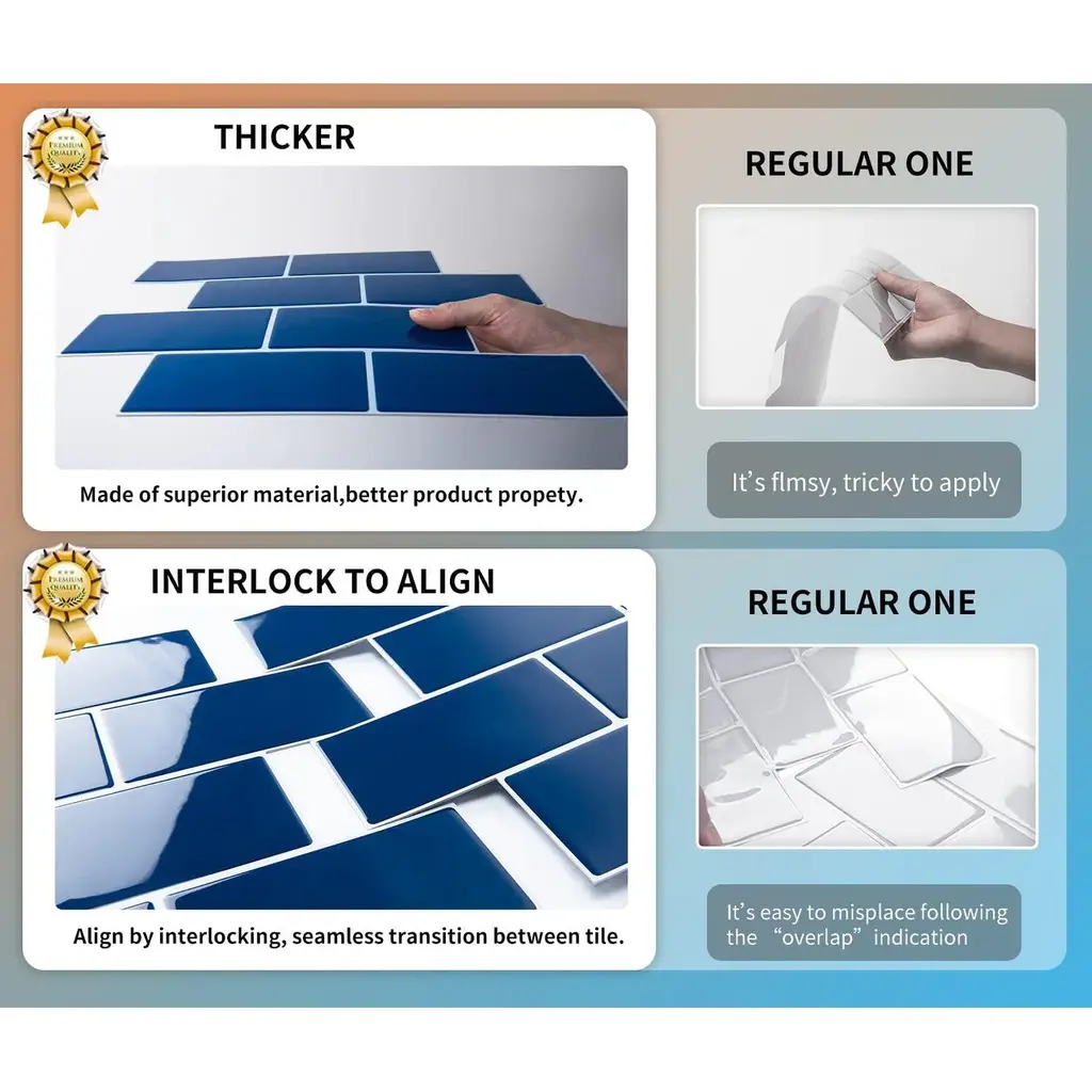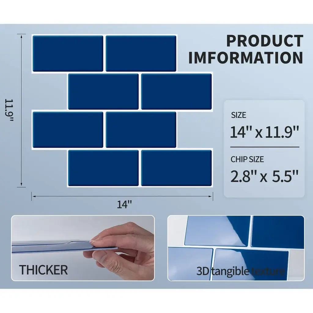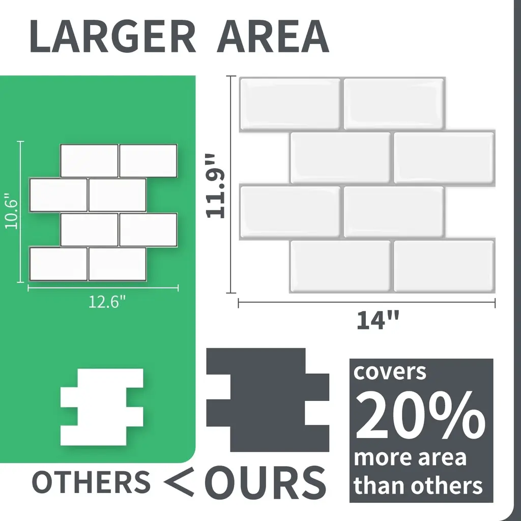 Upgrade your backsplash with Art3d Peel and Stick Backsplash Tiles. These 14x12 inch subway-style faux ceramic tiles come in a thicker version, making them 2-3 times thicker than ordinary peel and stick tiles. They have a durable and solid feel, unlike soft sticker tiles, and feature a 3D embossed texture that adds depth and character to any space. The tiles have a stronger adhesive backing, making them 3x more powerful than ordinary vinyl backsplash tiles, ensuring they stick firmly to smooth and lightly textured walls. Plus, they are waterproof and heat-resistant, perfect for kitchens and bathrooms. With an easy DIY installation process, just peel, interlock, and stick; no overlapping, grout, glue, or special tools required.Features: