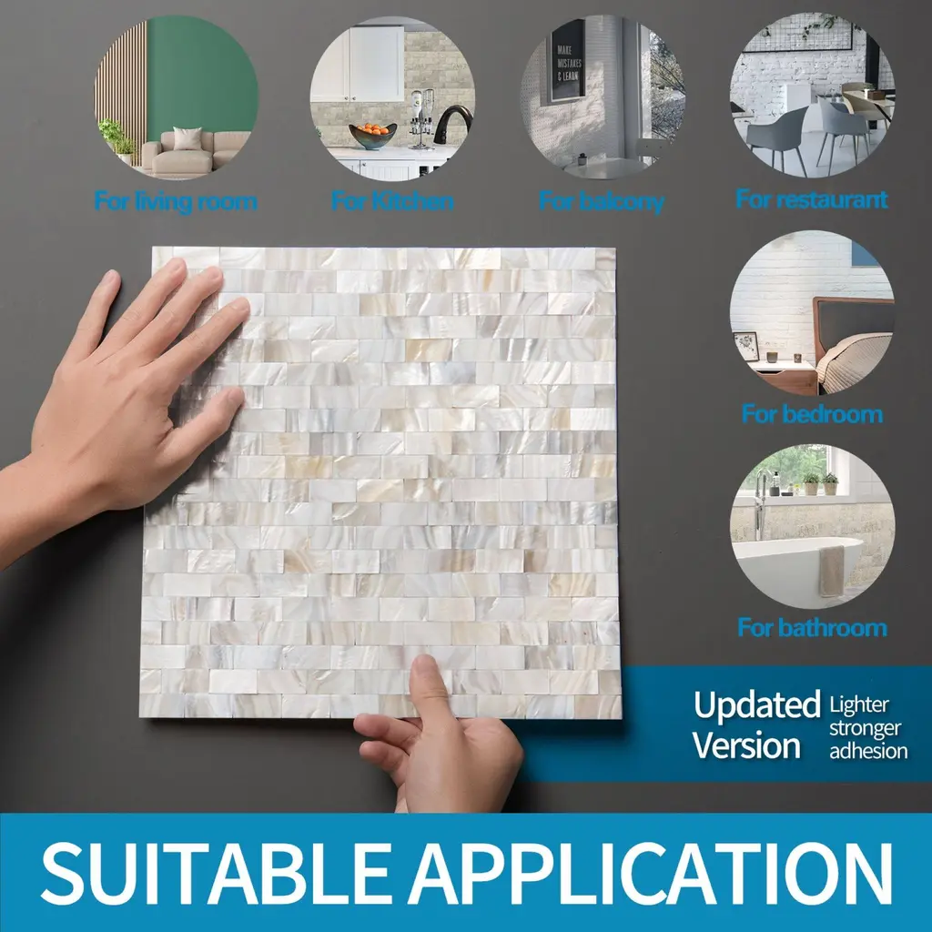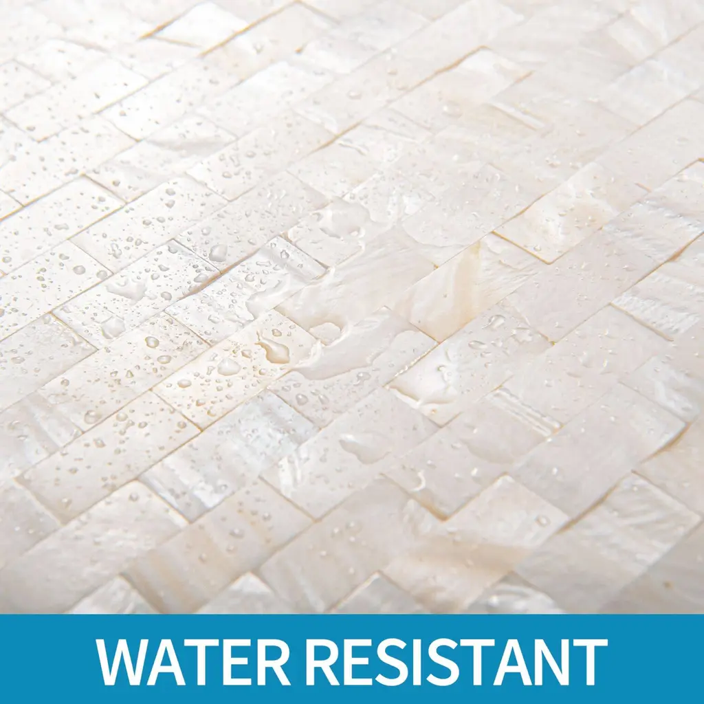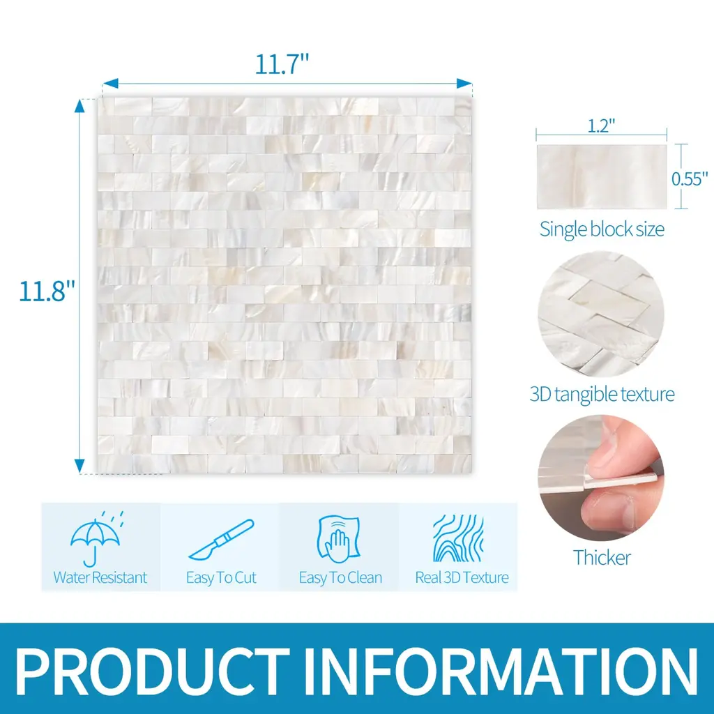 Bring a touch of elegance to your kitchen or bathroom with Art3d Peel and Stick Mother of Pearl Shell Tile. Made of premium quality genuine mother of pearl, each tile features a natural textured finish and peel and stick backing for easy installation. These tiles are perfect for kitchen backsplashes and bathroom walls. Please note, these tiles should not be used in the shower and are recommended for use in clean, dry, and smooth areas. As a natural product, the hues in mother of pearl may vary. Each pack includes 6 tiles measuring 11.8 x 11.8 x 0.08 inches (300*300*2mm).Features:Other sections: