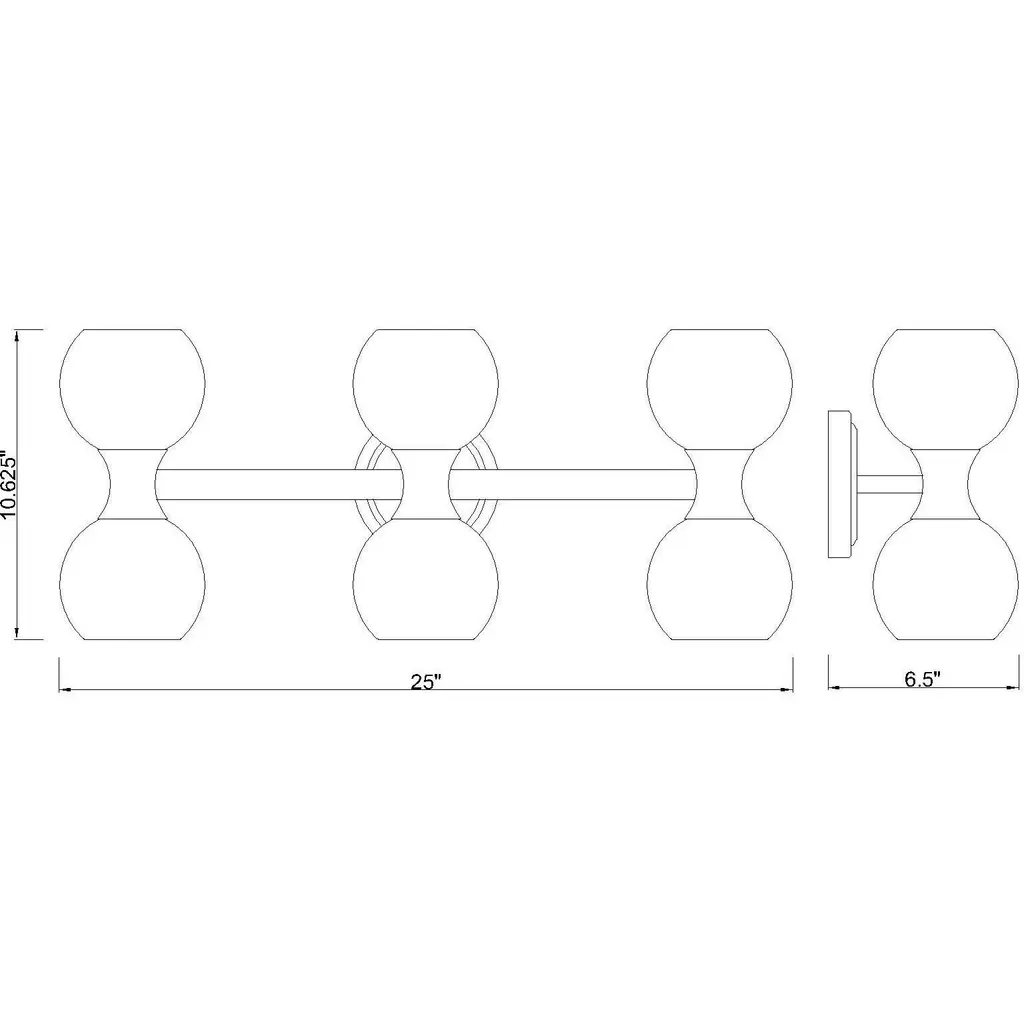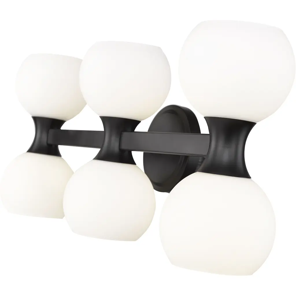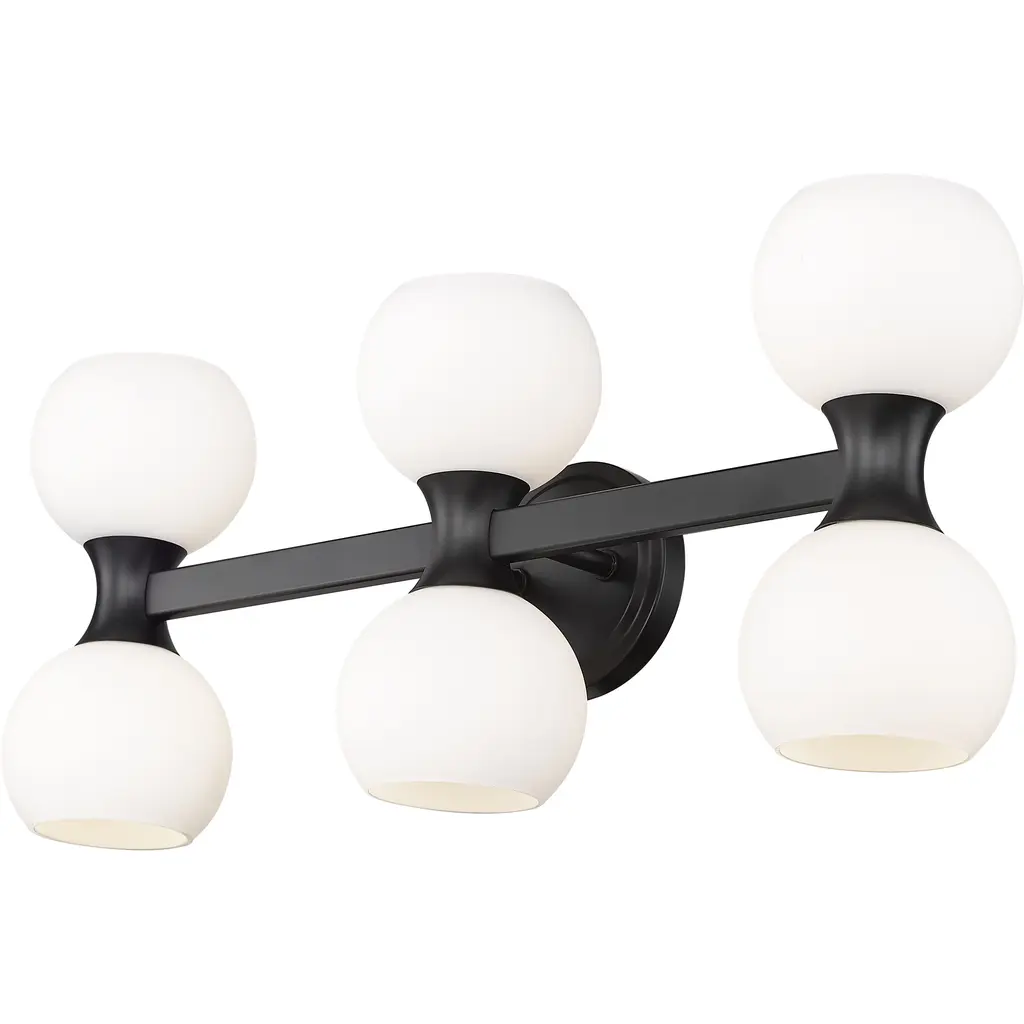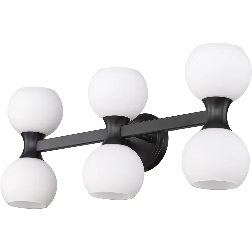 Spot the charming Mid-Century Modern aesthetic with subtle Art Deco style in a six-light bathroom vanity light from the Artemis collection. Follow the delightful convex shapes of a bold black finish steel frame and the delicate flavor of matte opal glass globe shades that form a notable contrasting palette with extra personality. Delivering both uplighting and downlighting, this vanity light brings solid illumination to an ensuite or guest bathroom.