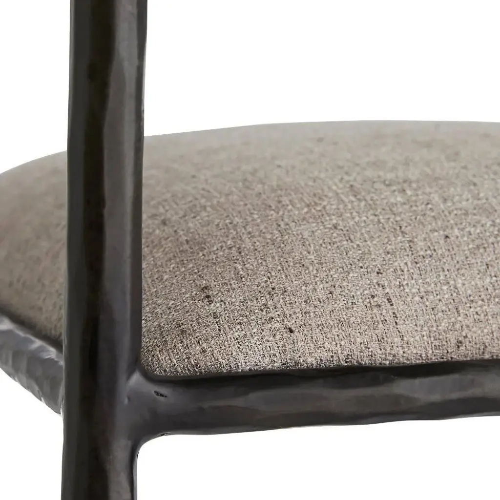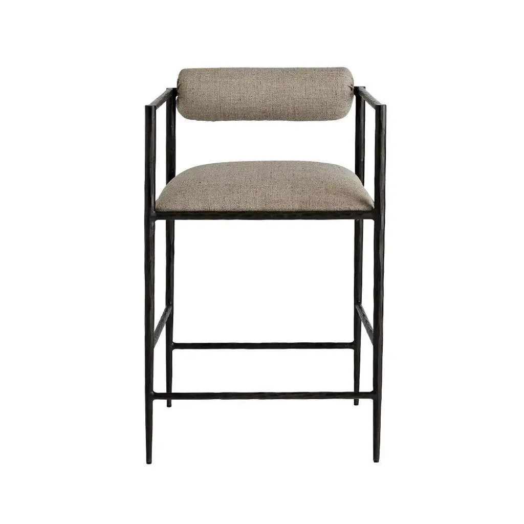 This exquisite stool is perfectly poised, perched on delicate legs that are as faint as insects'. The natural iron body has been hand-forged, yielding soft impressions along the sharp-angled frame. The tight seat and bolster back cushion are covered in a luxuriously textured pewter poly-blend. Finish may vary. Also available in bar height (4709) and as a chair (4543).