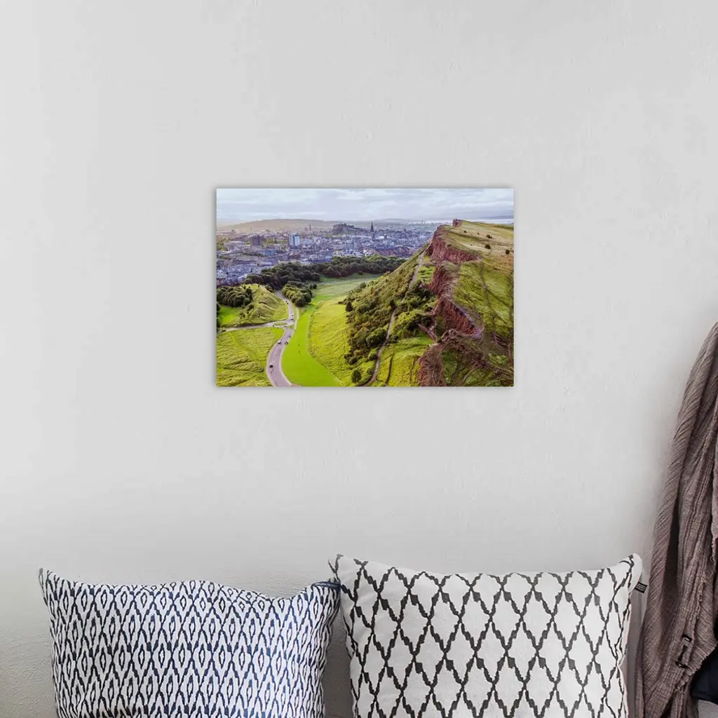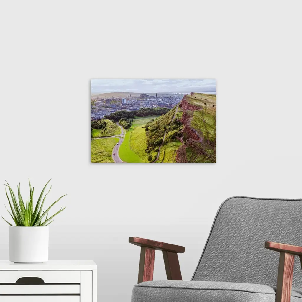 View of Edinburgh from Arthur's Seat and Holyrood Park in Scotland.