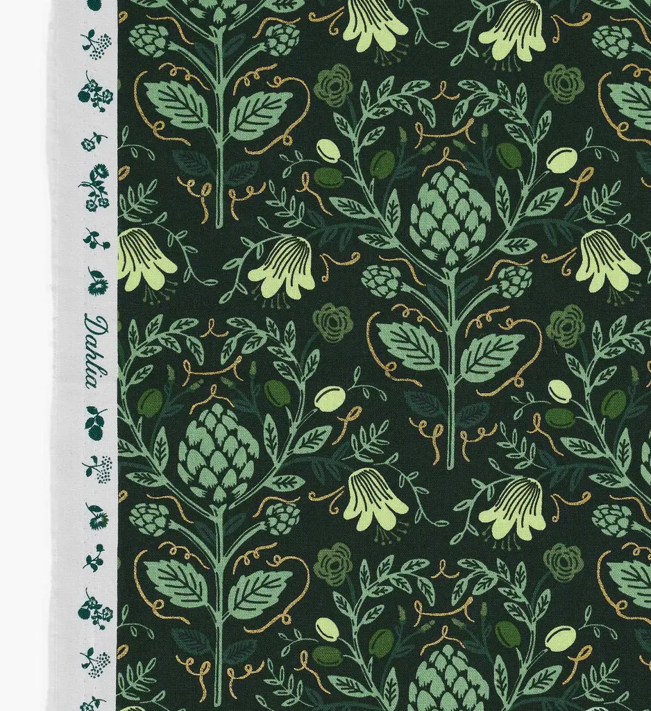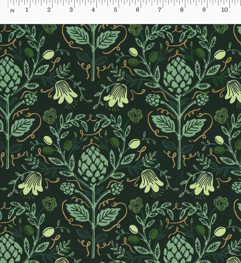 Inspired by hand-painted tiles and classic kitchen motifs, our Artichoke pattern is intricate and nostalgic. With metallic accents, our canvas material is made from a blend of cotton and linen, perfect for a range of crafts including bags, pillows, curtains, upholstery, structured garments, and more.