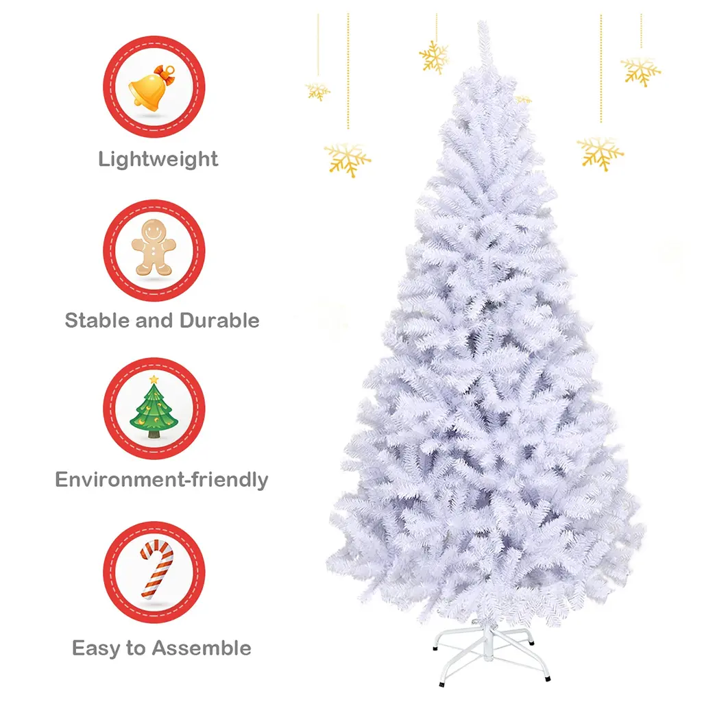 Description The Christmas tree with strong festive flavor is composed of PVC leaves and premium metal bracket. It is not only safe and harmless, but also firm and sturdy. It will be ideal for homes, offices, shops, apartments, etc. Use it to dress up your living space and accompany you through the holy Christmas! Features Specification Color: White Material: PVC, iron 1 X Christmas Tree 1 X Stand 1 X Instruction 6Ft Christmas Tree Overall Dimension: Diameter3.8ft x 6ft Number of tips: 1000 Net Weight: 11 lbs 7.5Ft Christmas Tree Overall Dimension: Diameter4.3ft x 7.5ft Number of tips: 1346 Net Weight: 19 lbs 9Ft Christmas Tree Overall Dimension: Diameter5ft x 9ft Number of tips: 2132 Net Weight: 31 lbs