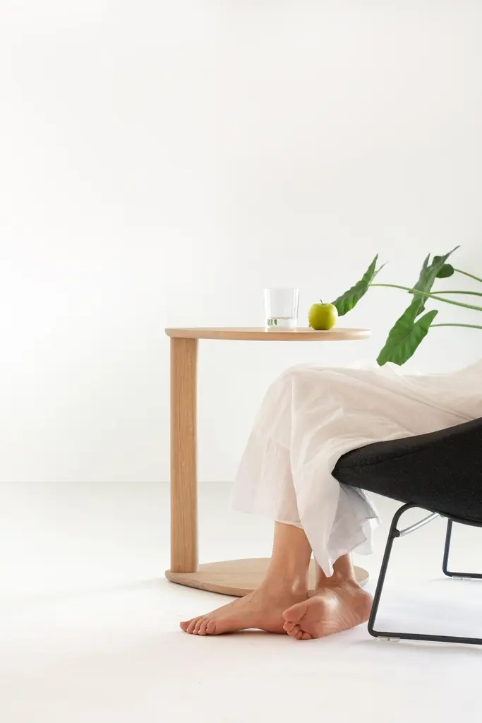 PRICE FOR FOUR. Artifort Compass tables are simple, elegant wooden sofa companions that enhance seating spaces, adapting naturally to our flexible lifestyles. The sofa is a place for many activities from lounging with a cup of tea and a book, to watching a movie, serving guests, planning a trip, or joining a meeting. Compass tables enhance the comfort of all of these activities, providing the perfect surface for a drink or the perfect position for your laptop. Compass’ semi-circular surface is welcoming from many angles, allowing you to easily position and reposition to suit your needs. You can rotate it to one side, position it in front of you, or hover it over your lap. Its low profile base slips conveniently under your sofa or chair while its cantilevered design brings the surface and your laptop comfortably close. Compass works in perfect harmony with Artifort sofas and chairs and is available in Artifort’s wood finishes. Compass tables come in two heights; the 57cm height complements lounge seating and the 65 cm height fits more agile and upright sofas and armchairs. Top, base and column in solid oak in standard oil finish. Minimum order 4 pieces. (2 low and 2 high or 4 low or 4 high). Version per 2 pieces equal.orTop, foot and column in solid oak, where the top and foot are provided with a laminate top layer. The other parts in oil finish O02 Pure. Minimum order 12 pieces in one version.Finishing edge; underside belly milled. Column 6,5x3cm.Compass is disassembled, delivered flatpack. Assembly time ±10 minutes.5 felt caps are supplied separately.Maximum load ±15 kg. For intended use only.