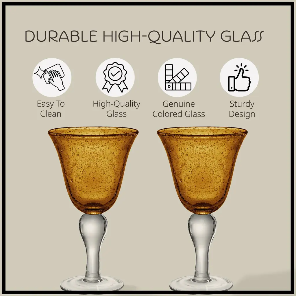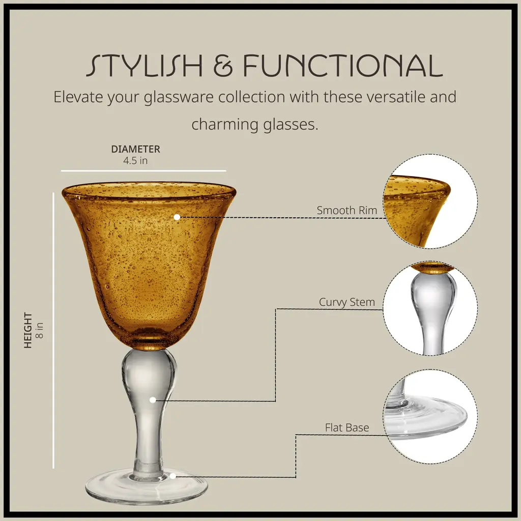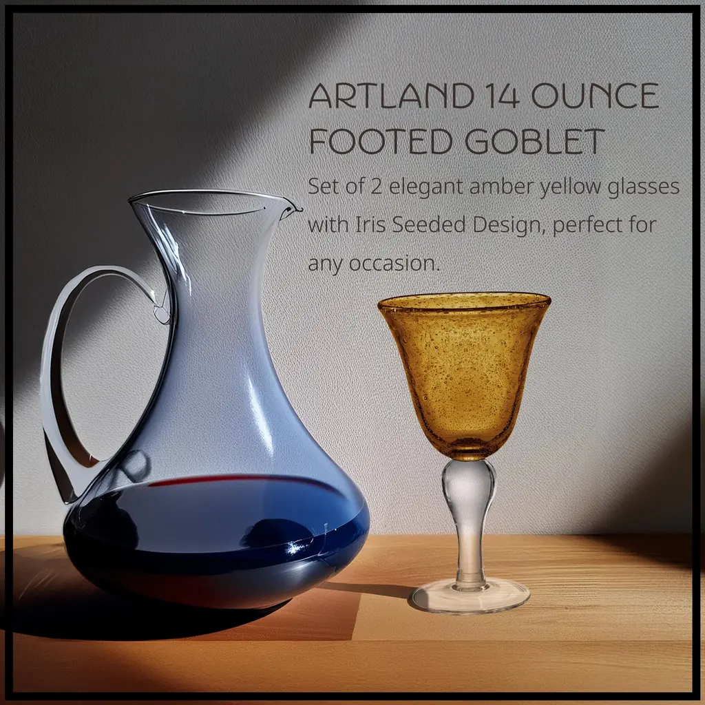 Artland Iris Goblet, 14-Ounce Set (Amber) - NewRefresh your beverage with a profusion of free-form bubbles with a goblet glass from Artland's Iris Seeded collection. These glasses are lead-free. The unique glasses are hand made and have an amber color. Each hand blown glass is unique and has slight variations in the color, bubble formation, and shape. Even better, they are dishwasher safe for easy clean up. 4-1/2" diameter x 8-1/4" H, with a 14 ounce capacityFEATURES:COLOR:MATERIAL:WHAT'S IN THE BOX:PACKAGING: Retail Packaging