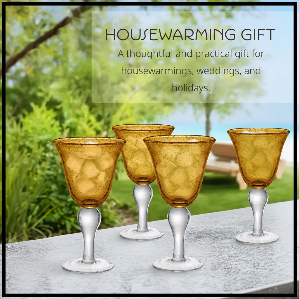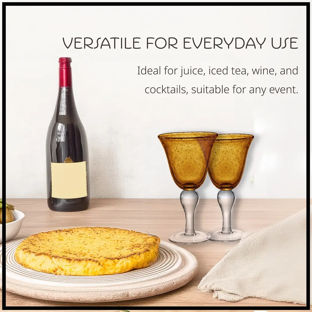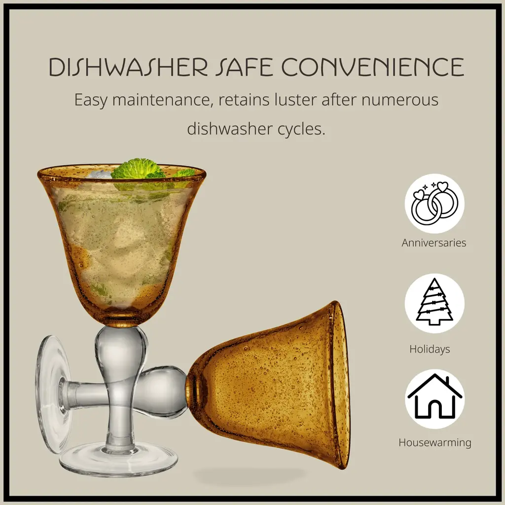 Artland Iris Goblet, 14-Ounce Set (Amber) - NewRefresh your beverage with a profusion of free-form bubbles with a goblet glass from Artland's Iris Seeded collection. These glasses are lead-free. The unique glasses are hand made and have an amber color. Each hand blown glass is unique and has slight variations in the color, bubble formation, and shape. Even better, they are dishwasher safe for easy clean up. 4-1/2" diameter x 8-1/4" H, with a 14 ounce capacityFEATURES:COLOR:MATERIAL:WHAT'S IN THE BOX:PACKAGING: Retail Packaging