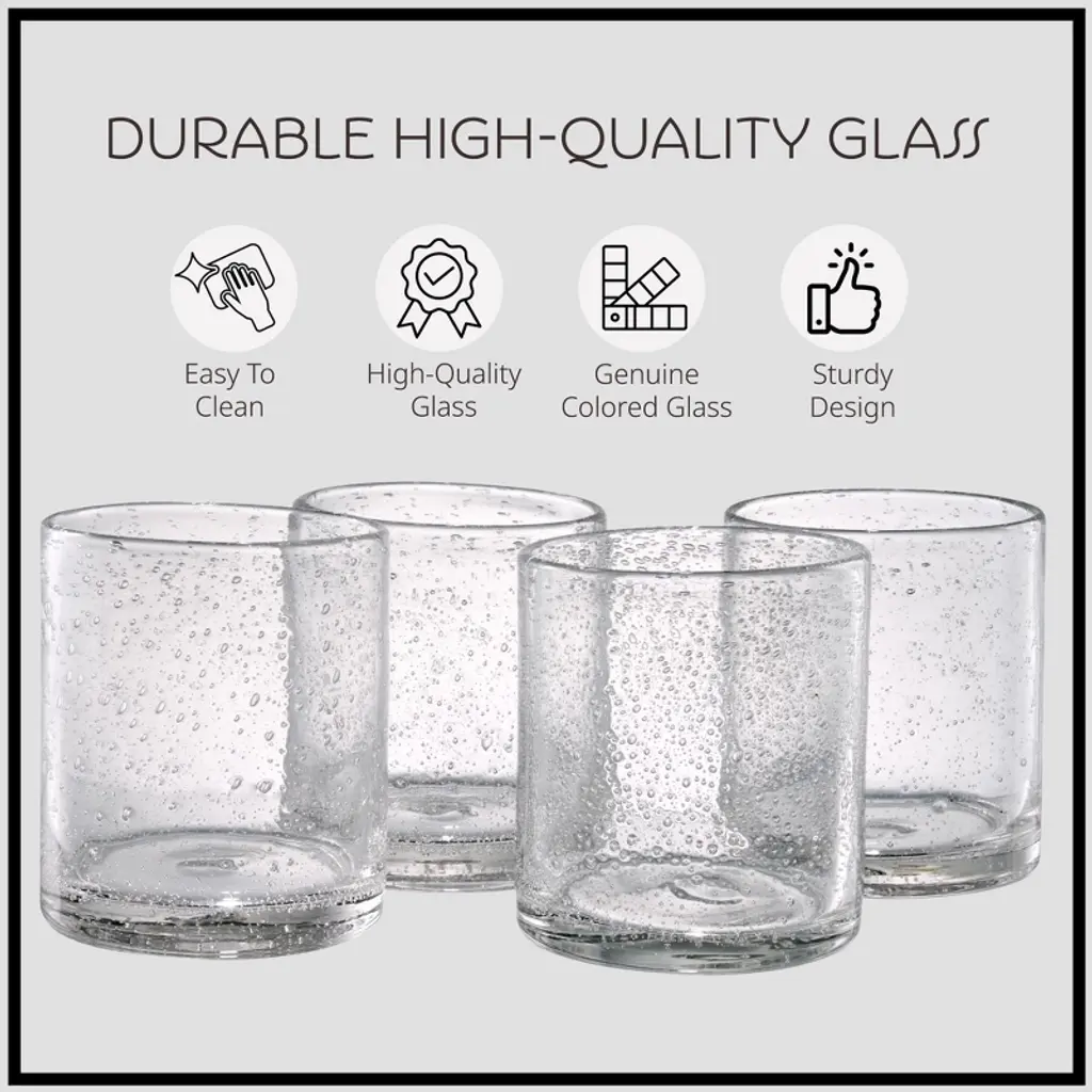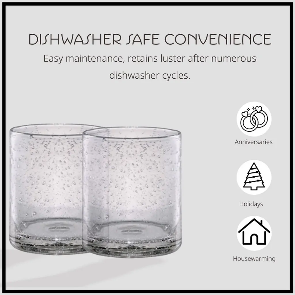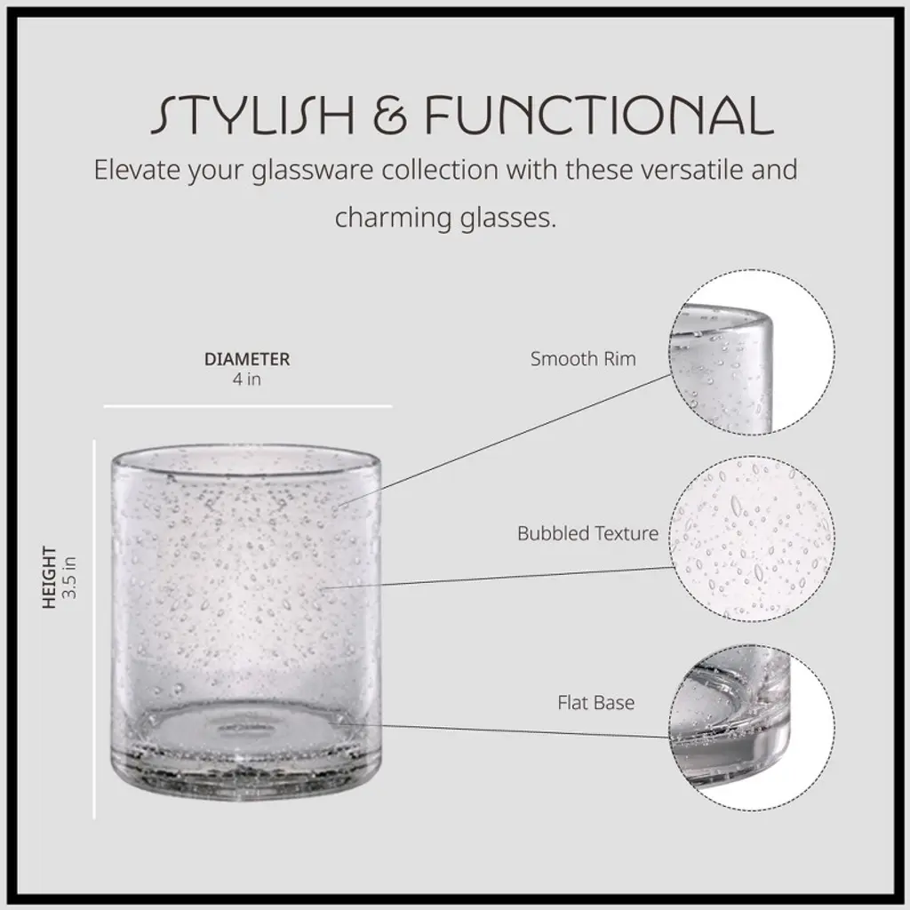 Hundreds of vivacious miniature bubbles bubbles lend a refreshing elegance to these glasses. This double old fashioned glass holds 14 oz. of liquid and is perfect at meals both casual and formal. Put together a versatile set of glassware with goblets, footed ice teas, highballs and shorter tumblers from the Iris Collection (sold separately). Dishwasher safe. Imported.