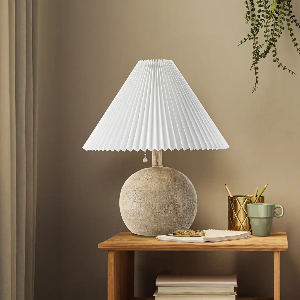 A modern take on mid-century Danish lamps, this vintage-inspired lamp features a heavy resin base and pleated, linen shade. Its timeless geometric style is perfect for a modern bedroom, living room, or entry. Includes an LED bulb for warm, bright light.Features:Dimensions:About us:You see a lamp.We see a decorative work of art.A perfectly curved shade casts a dramatic shadow on a floor. Compatible with LED lightbulbs: as easy on the environment as they are on the eyes. The JONATHAN Y Lighting collection considers every detail from impeccably sourced materials to designer styling. And our prices are so attractive, we've transformed a functional necessity into a fashion accessory.JONATHAN Y Lighting - a fashion revolution in home decor.