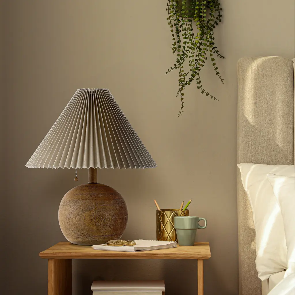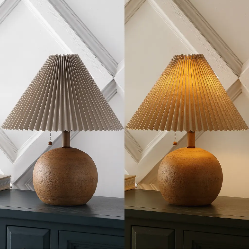 A modern take on mid-century Danish lamps, this vintage-inspired lamp features a heavy resin base and pleated, linen shade. Its timeless geometric style is perfect for a modern bedroom, living room, or entry. Includes an LED bulb for warm, bright light.Features:Dimensions:About us:You see a lamp.We see a decorative work of art.A perfectly curved shade casts a dramatic shadow on a floor. Compatible with LED lightbulbs: as easy on the environment as they are on the eyes. The JONATHAN Y Lighting collection considers every detail from impeccably sourced materials to designer styling. And our prices are so attractive, we've transformed a functional necessity into a fashion accessory.JONATHAN Y Lighting - a fashion revolution in home decor.