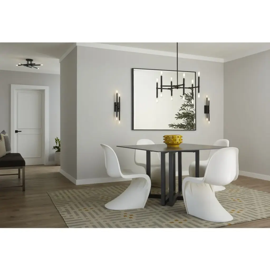 The Arya Collection has a lively essence created by the rhythm of slender, graceful features. The style offers modern appeal with understated elegance. A pair of staggered arms coated in an elegant matte black are attached to a simple square backplate, defining this bold architectural form. The minimalist wall bracket brings a modern flair to ceilings in dining rooms, bedrooms and living rooms in luxe, mid-century modern and contemporary settings. It can be mounted horizontally or vertically. This fixture is part of the Progress Lighting Design Series, a lighting collection offering fashionable styles and affordable luxury lighting for the home.