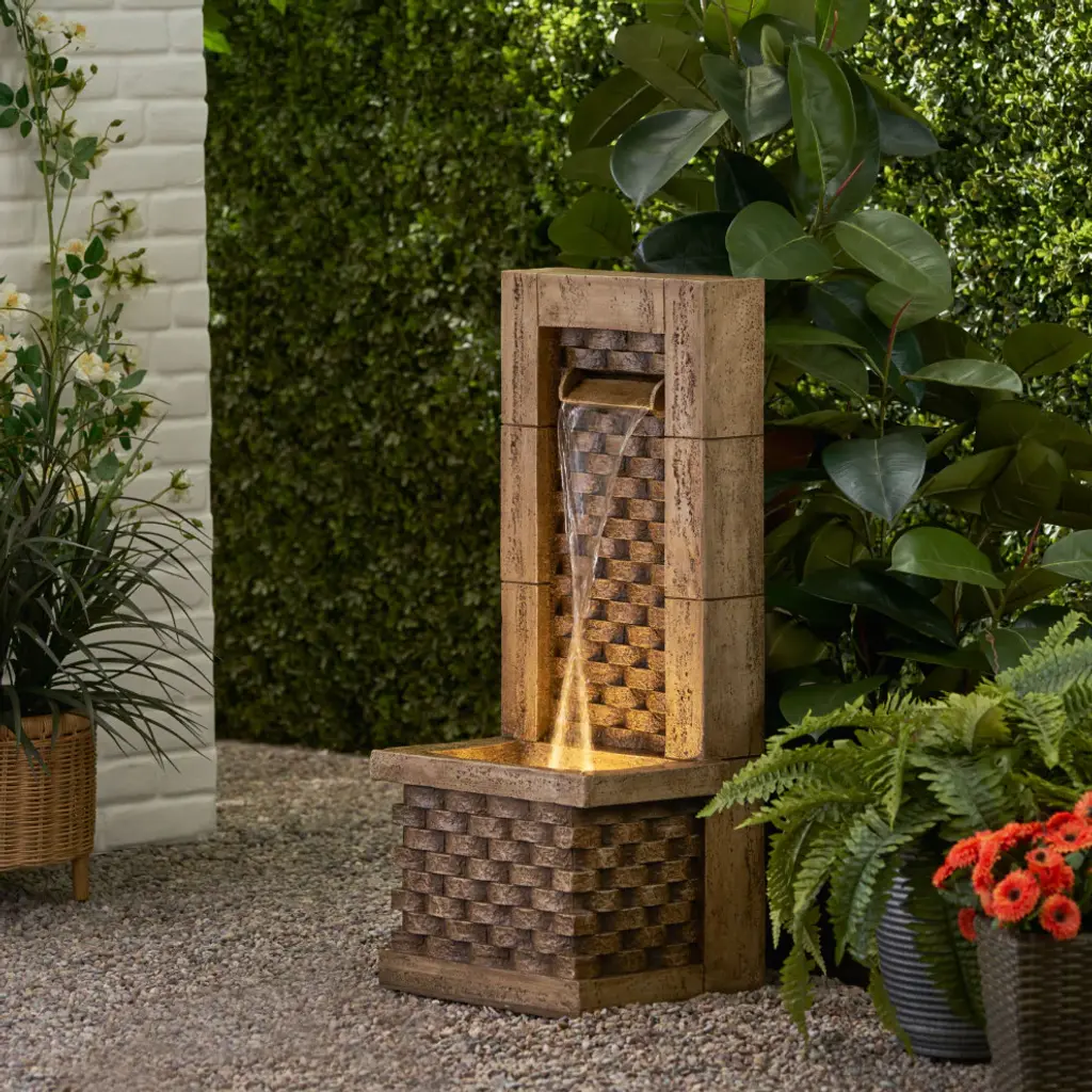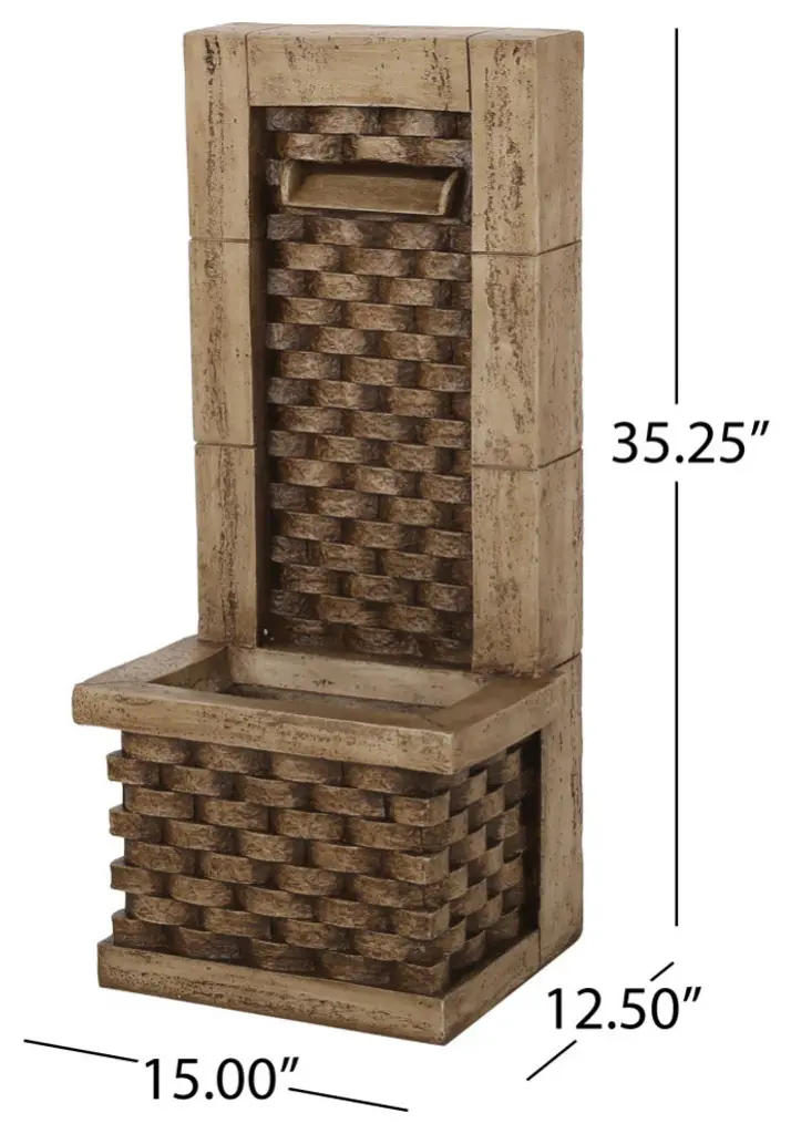 Make a subtle statement in your outdoor space with an accessory of peaceful ambiance. Our garden fountain features a calm waterfall flow that continuously circulates using an included pump, bringing a playful aura to any backyard or patio. Crafted with an incredibly durable polyresin material, this decorative accessory offers a weather-resistant structure that allows outstanding attention to detail. Finished with an impressive wall tower design and enchanting underwater lights, our water fountain is sure to add a touch of whimsy to your home.A TOUCH OF PERSONALITY: Easily customize your backyard, garden, or patio with this charming outdoor water fountain. With a playful design and stunning attention to detail, this accessory will be sure to enhance any outdoor space.WATERFALL FLOW: With a gentle and relaxing water flow, this garden fountain uses an interior pump to bring a peaceful atmosphere to your outdoor space. This fountain features a wall tower design that creates a beautiful waterfall effect.FAUX STONE: Crafted with a stone-like material, this fountain provides a weather-resistant foundation that has clean-cut edges. This can be easily poured into flexible molds that brings outstanding details to each piece.LED LIGHTS: The base of this fountain is illuminated with underwater LED lights for a dynamic effect on your outdoor decor. These lights offer an eco-friendly, energy-efficient option that saves you electricity and money. These lights have an incredibly long life span and do not burn out like regular bulbs. They will simply begin to dim once it begins to lose its energy.DIMENSIONS: Choose an accessory that is the perfect size for you and your furniture. This fountain is 15.00" W x 12.50" D x 35.25" H. You will love how much your space can transform with the simple addition of this charming fountain.