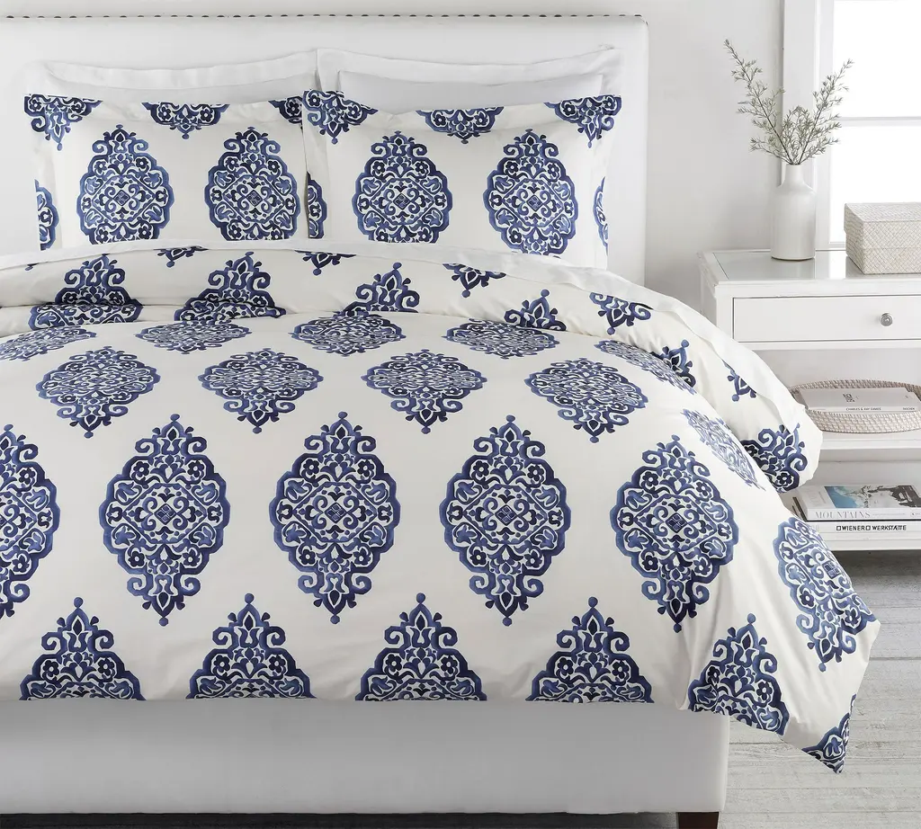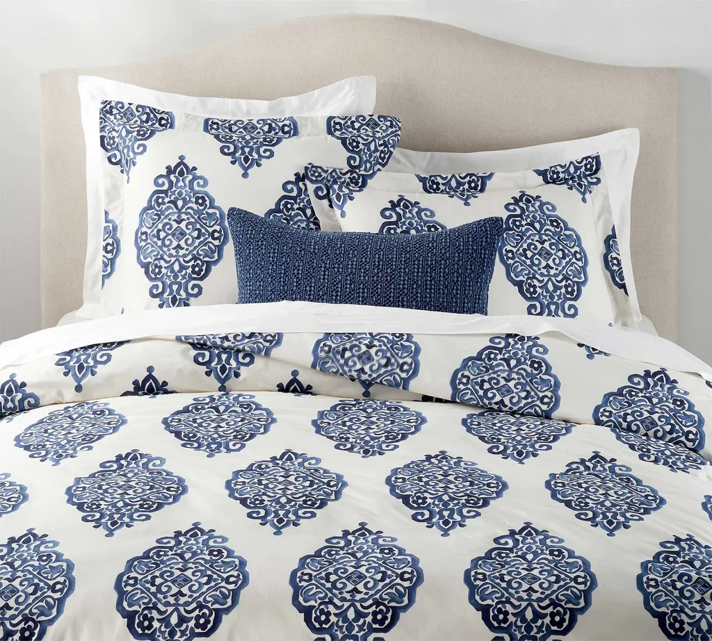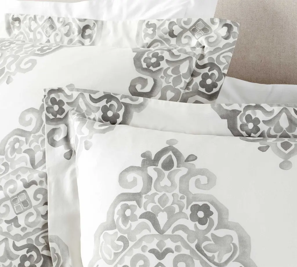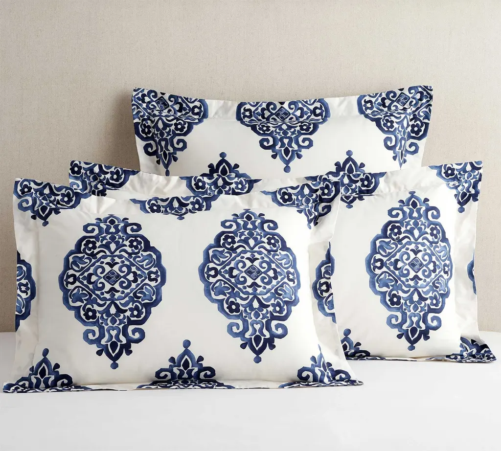 Moroccan-style motifs swirling with tiny florals are rendered on our Asher Medallion Shams. The hand blocked–inspired pattern is brought to life on pure cotton, produced using mindful methods that are kinder to the environment.