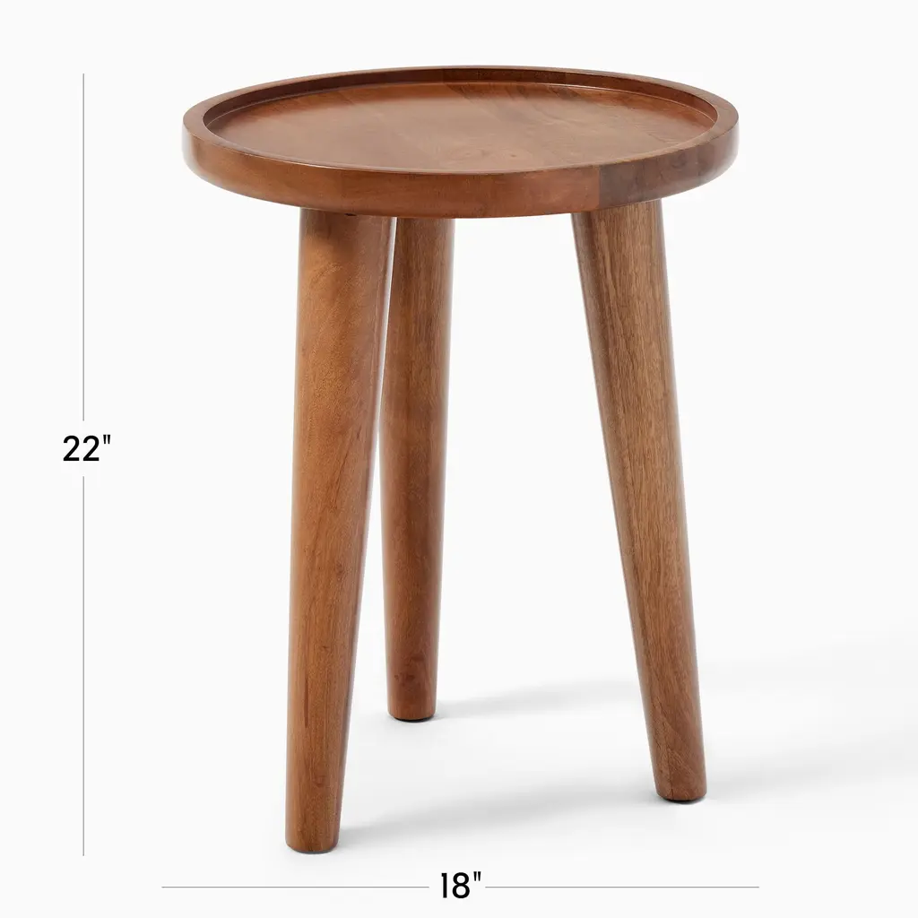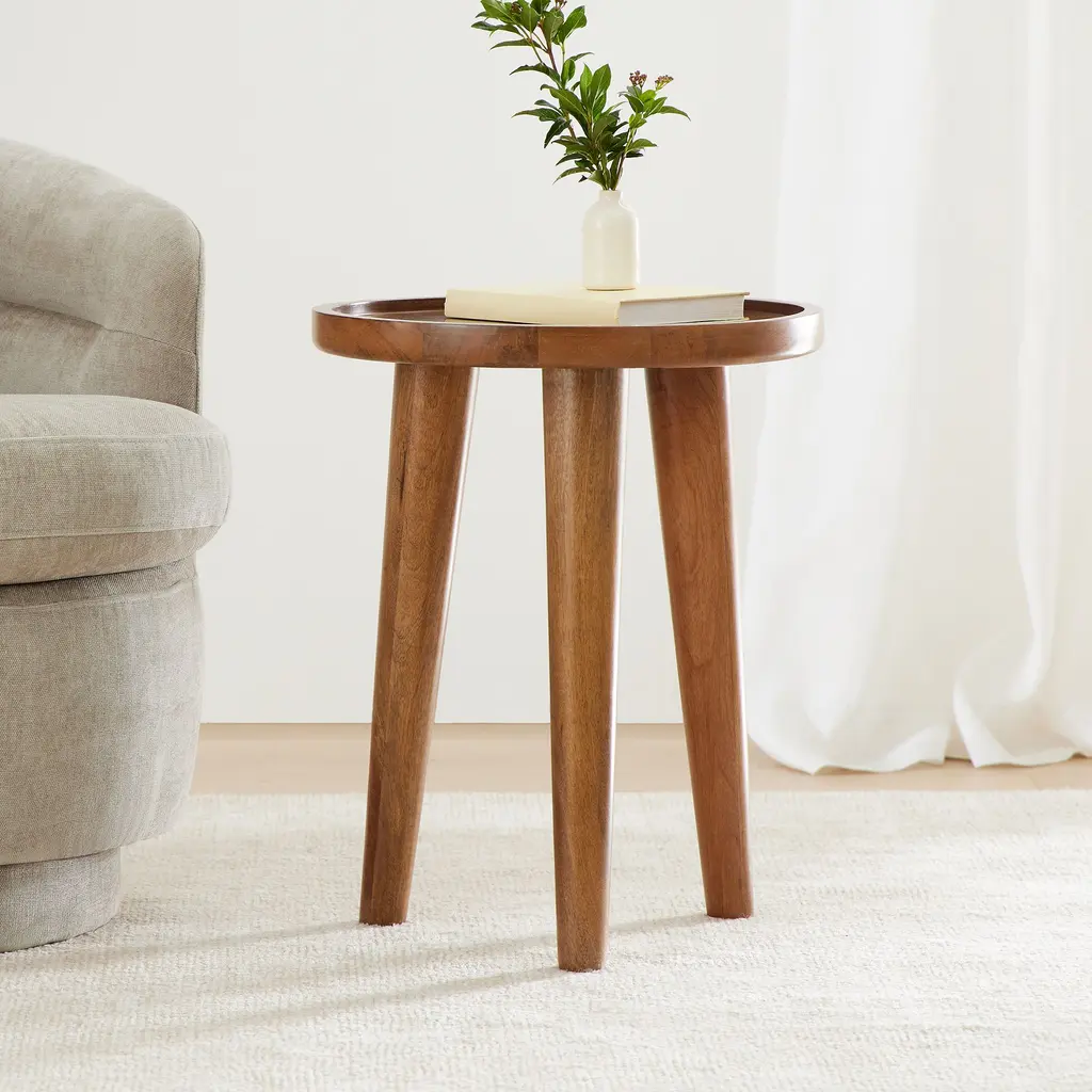 Raised-edge top combines style and function. A trio of angled legs gives it sculptural flair. Low-sheen finish shows off the wood grain. Made from sustainably sourced mango wood.