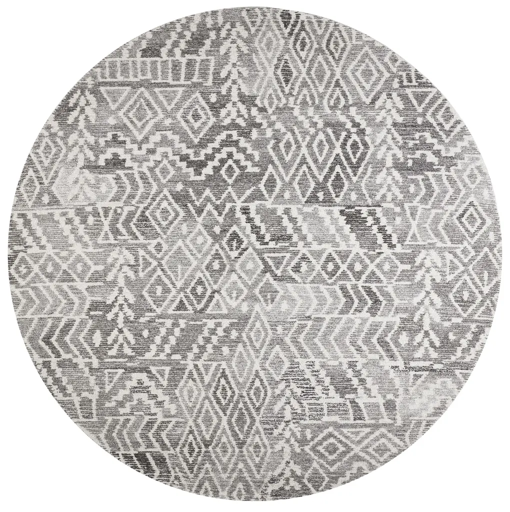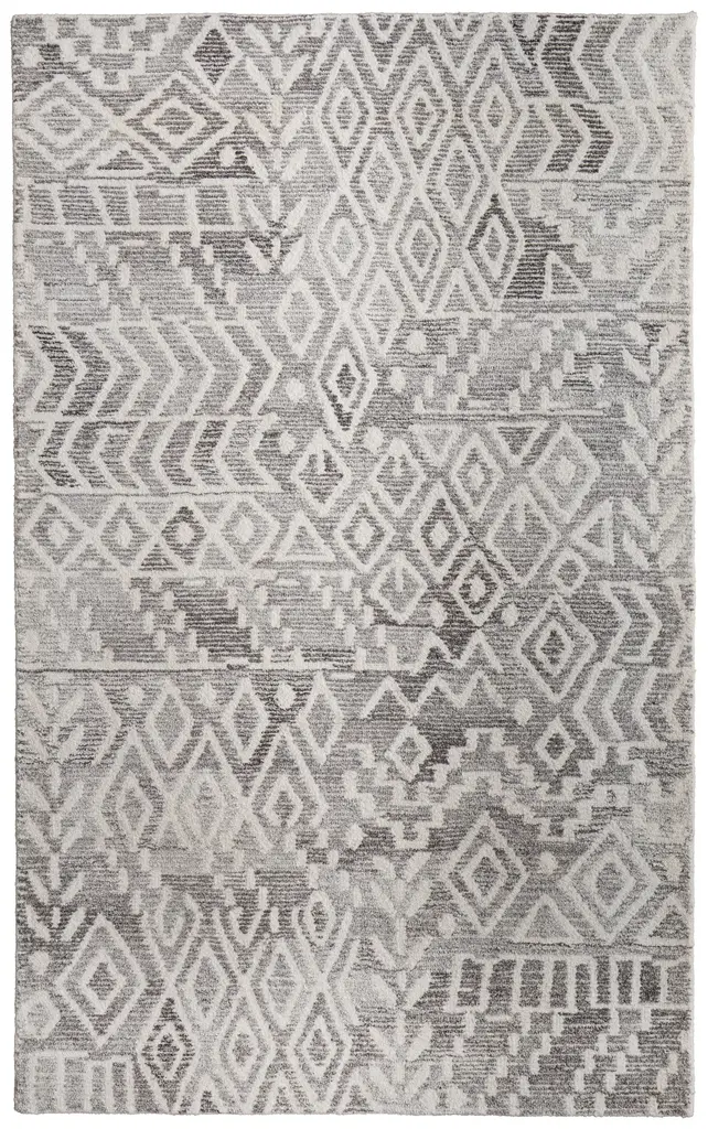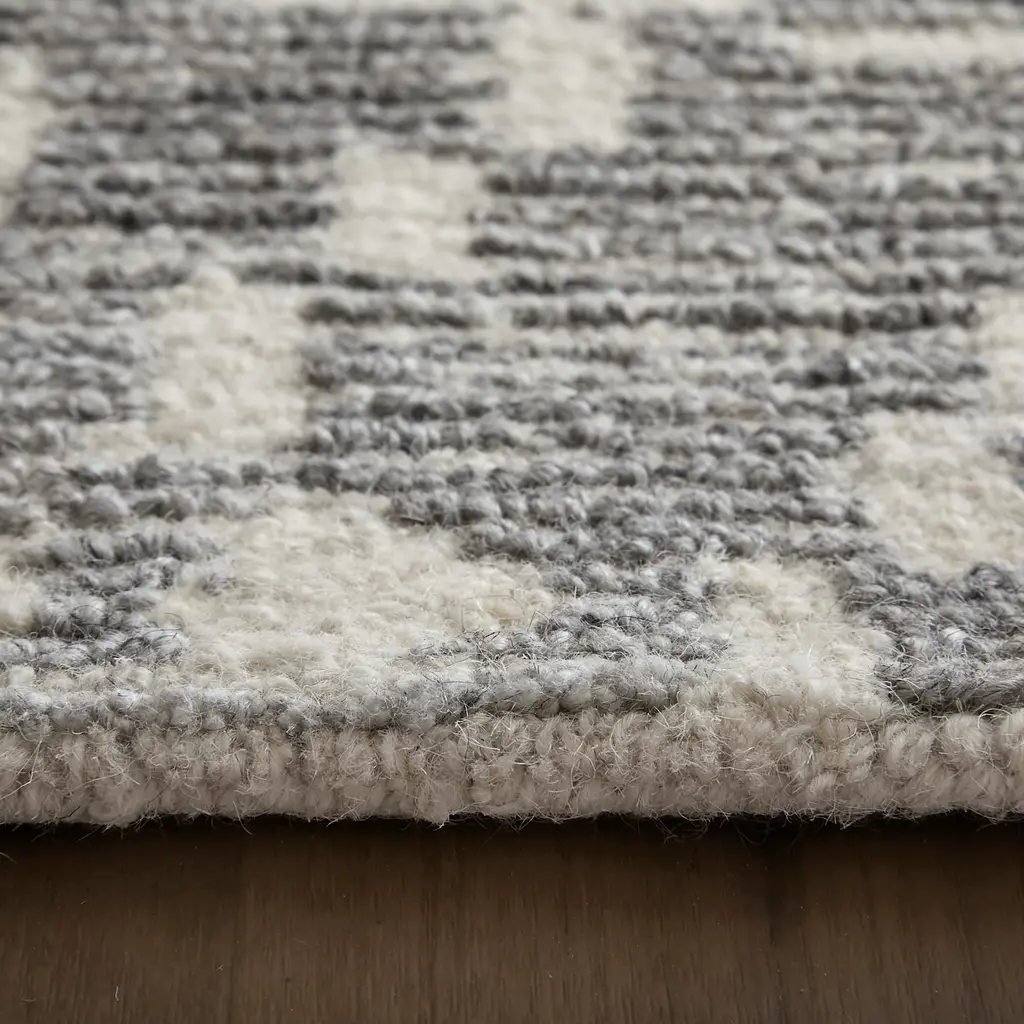 Collection: Asher Colors: Gray, White Construction: Hand Tufted Material: Face: Wool, Viscose / Warp: Cotton Pile: Medium Pile Pile Height: 0.55" Styles: Transitional,Bohemian & Eclectic,Bohemian Backing: Cotton Made In: India Thickness: 0.55" Price Range: $$$$$ (Affordable)