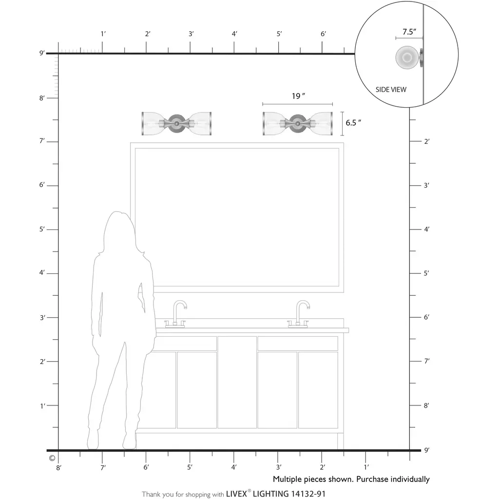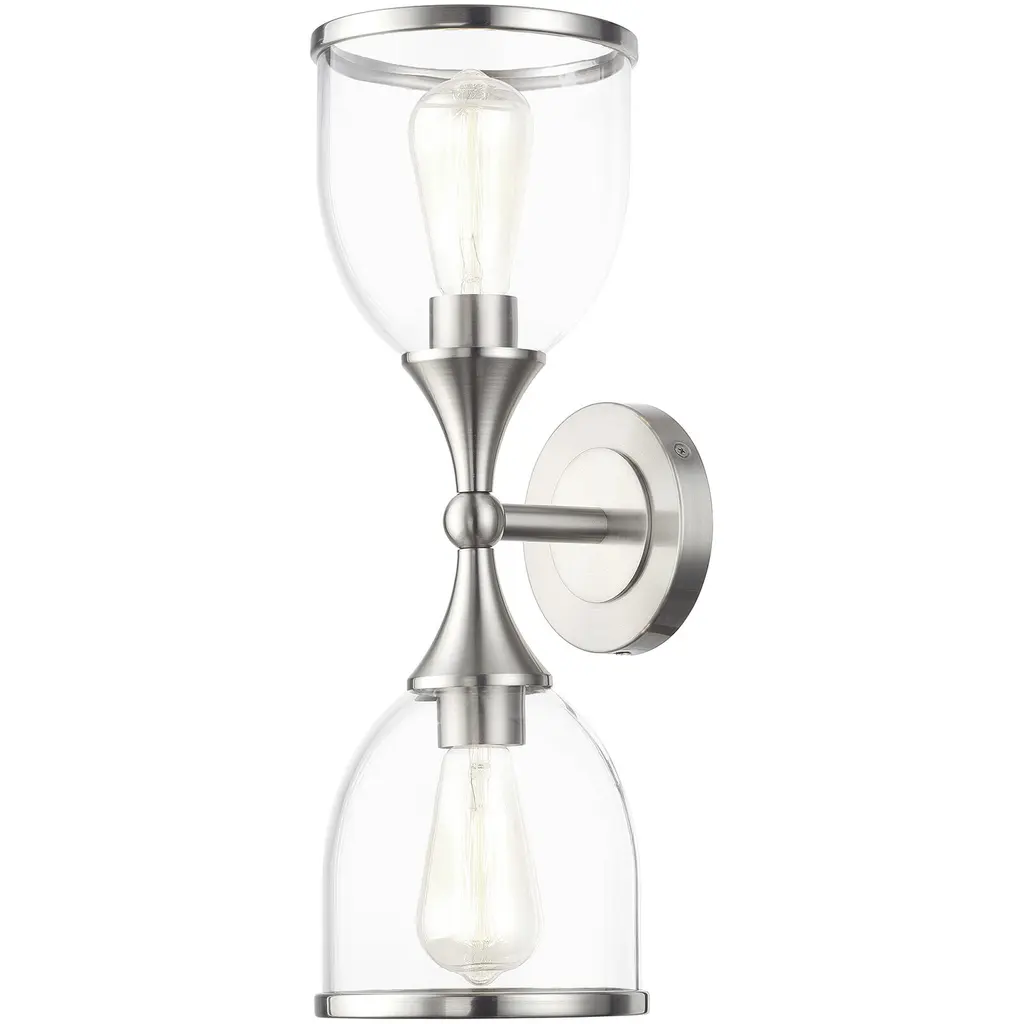 Our elegant and versatile Ashridge collection features a contemporary design, reminiscent of 19th century lighting. This two light vanity sconce comes in a brushed nickel finish with mouth blown clear glass and can mount horizontal or vertical.
