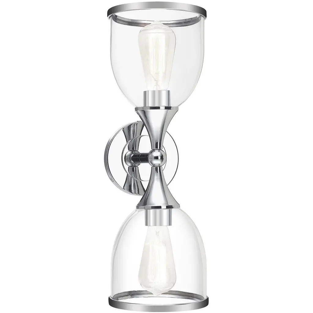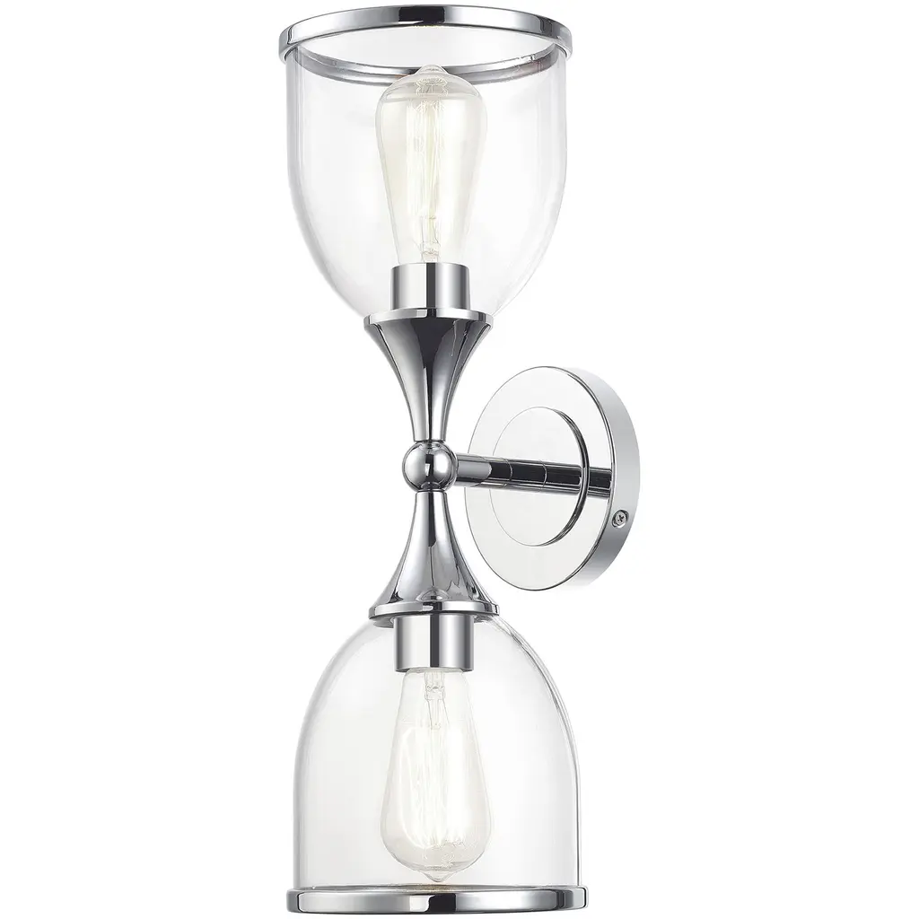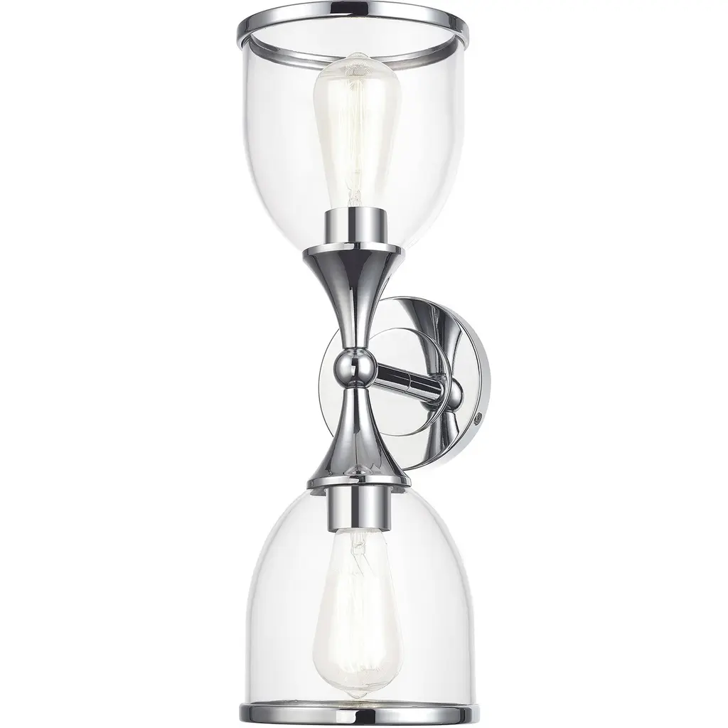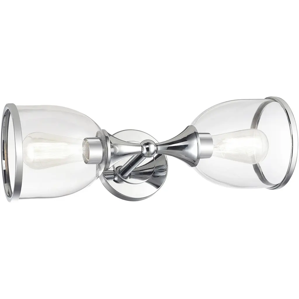 Our elegant and versatile Ashridge collection features a contemporary design, reminiscent of 19th century lighting. This two light vanity sconce comes in a polished chrome finish with mouth blown clear glass and can mount horizontal or vertical.