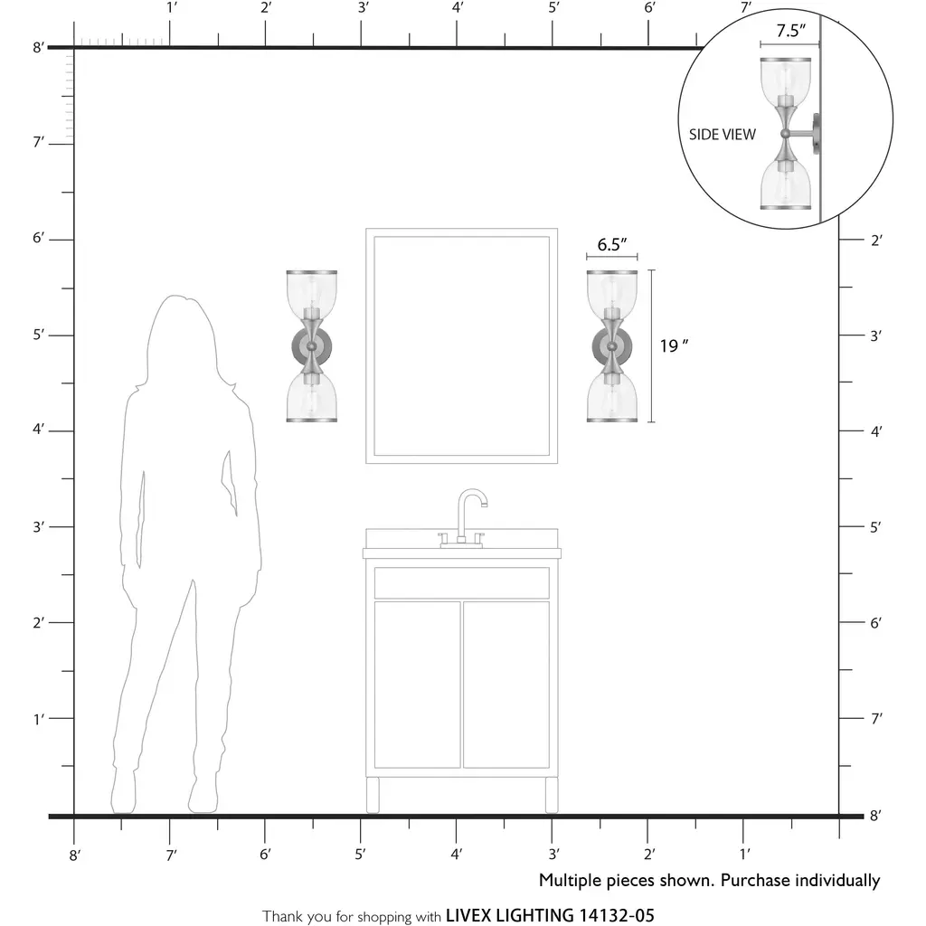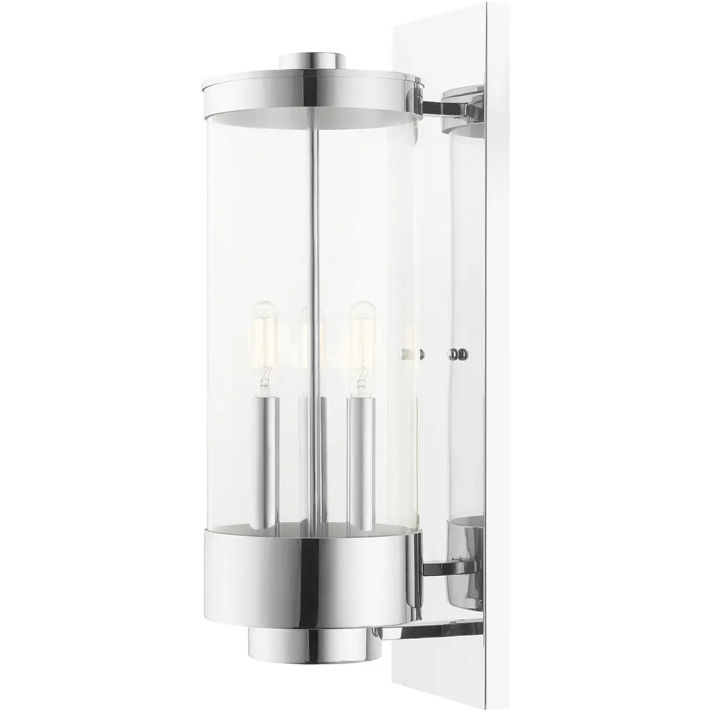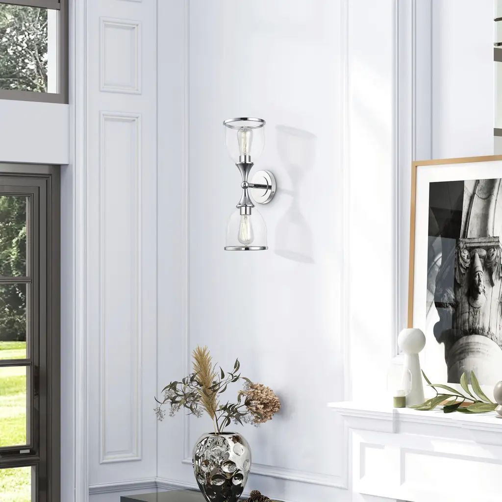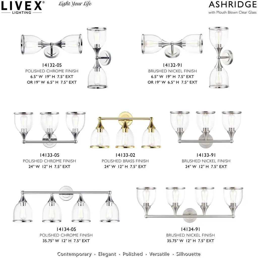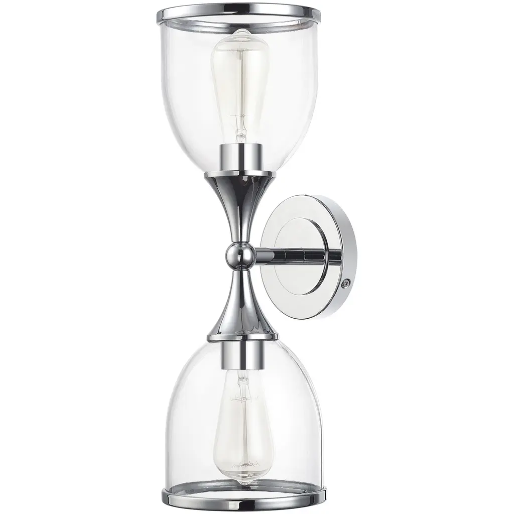 Our elegant and versatile Ashridge collection features a contemporary design, reminiscent of 19th century lighting. This two light vanity sconce comes in a polished chrome finish with mouth blown clear glass and can mount horizontal or vertical.
