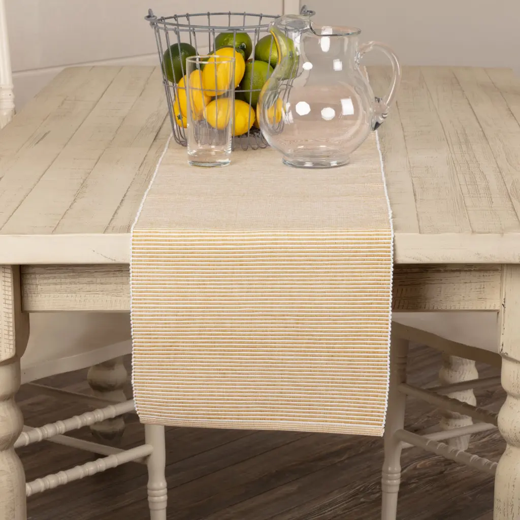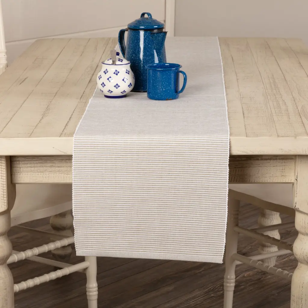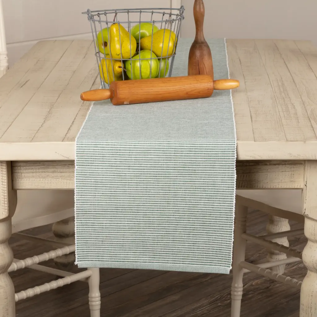 The 13x72 Ashton Ribbed Runner features a dusty shale and creme in a classic candy stripe pattern on a rib weave. Perfect for farmhouse or even urban settings, this runner provides a light hearted touch to your table.Features PREMIUM CONSTRUCTION: with over two decades experience crafting goods for American homes, our items are built to last for years to come.FARMHOUSE DECOR: fits your farmhouse home with updated country style.QUALITY MATERIAL: made with durable 100% cotton for a proper look and feel.Dusty shale and creme in a classic candy stripe pattern complement any table settingThe continuous weave produces distinct rounded edges which resist fraying and add to the longevity of the runnerEach .5" end is tightly woven and foldedRib Weave: Loom woven, Machine stitchedSpecifications Material: 100% CottonManufacturer Country: IndiaCare: Hand Wash, Lay Flat to Dry, Iron safeSizes Available 13" x 72" - 0.8 lb13" x 90" - 0.9 lbColors Available Burgundy - Burgundy, CremeGold - Gold, CremeGreen - Basil Green, CremeGrey - Dusty Shale, CremeRed - Cherry Red, CremeRust - Rust, CremeTaupe - Taupe, Creme