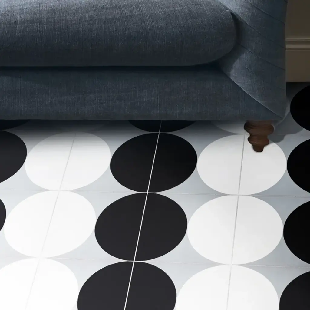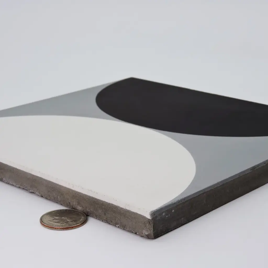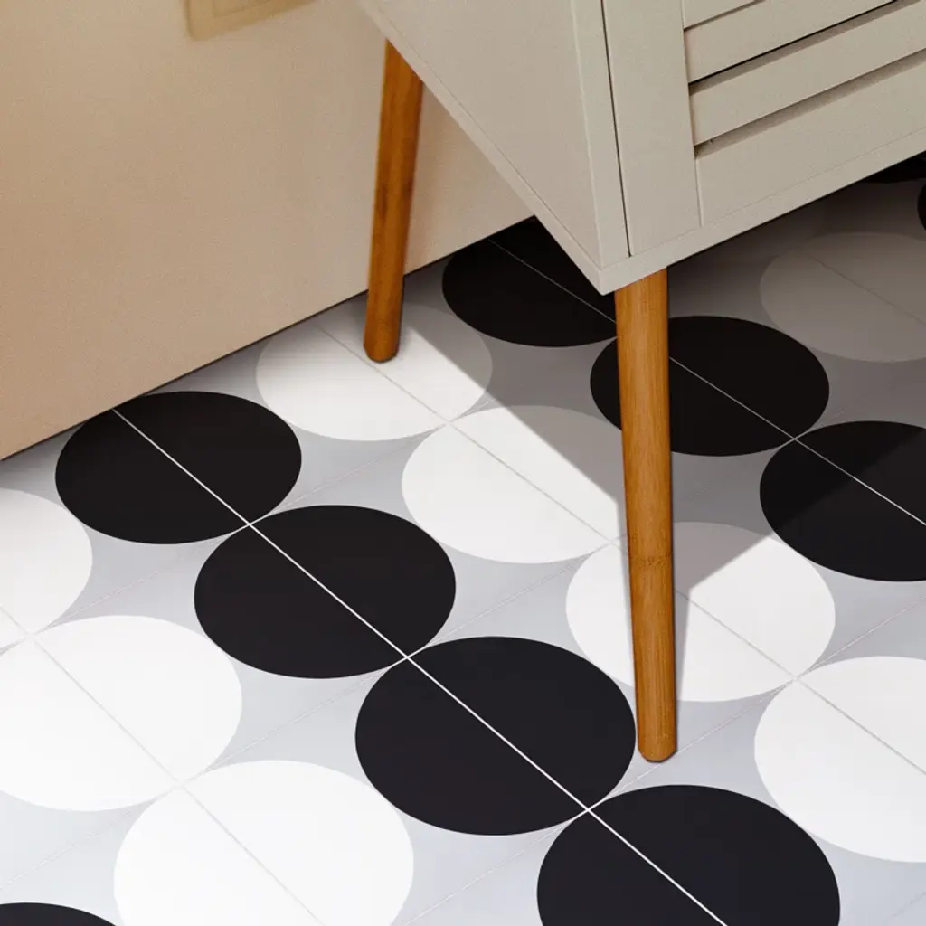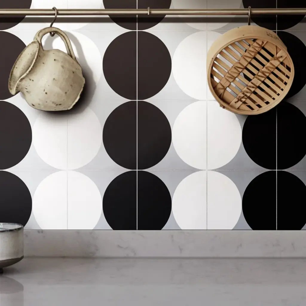 Asni is a bold and modern tile. Its circular pattern provides a visual statement of vibrance and energy. Asni’s dynamic black, white and gray coloring will complement any room in your home.