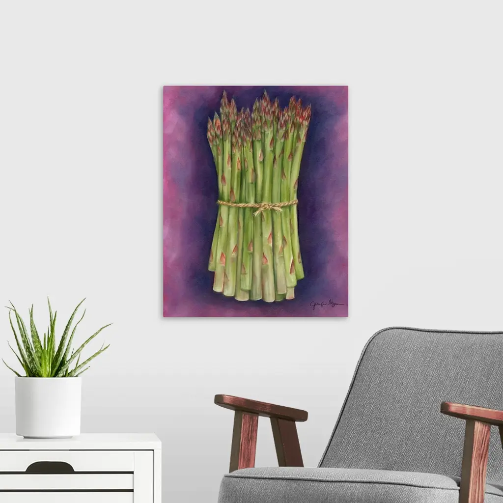 Kitchen wall art by Jennifer Goldberger featuring a bundle of asparagus on a soft painted background.