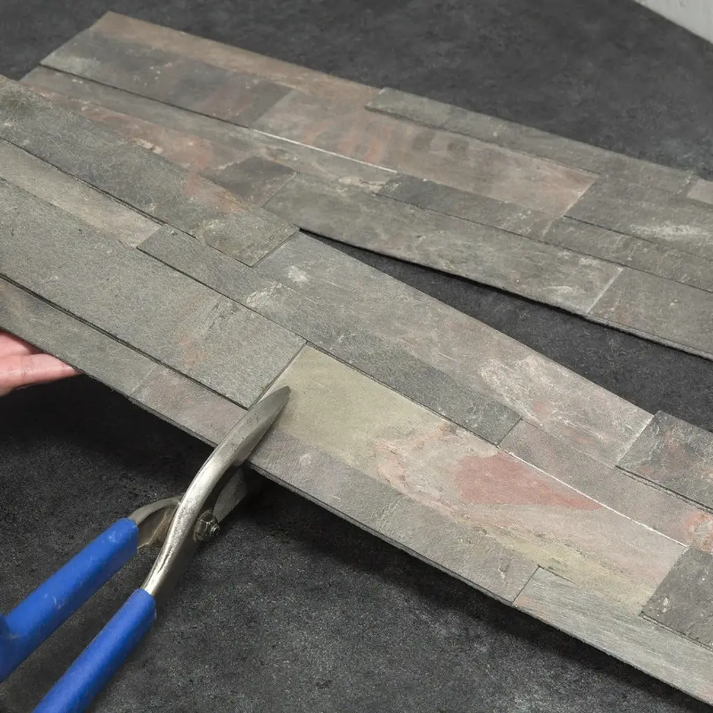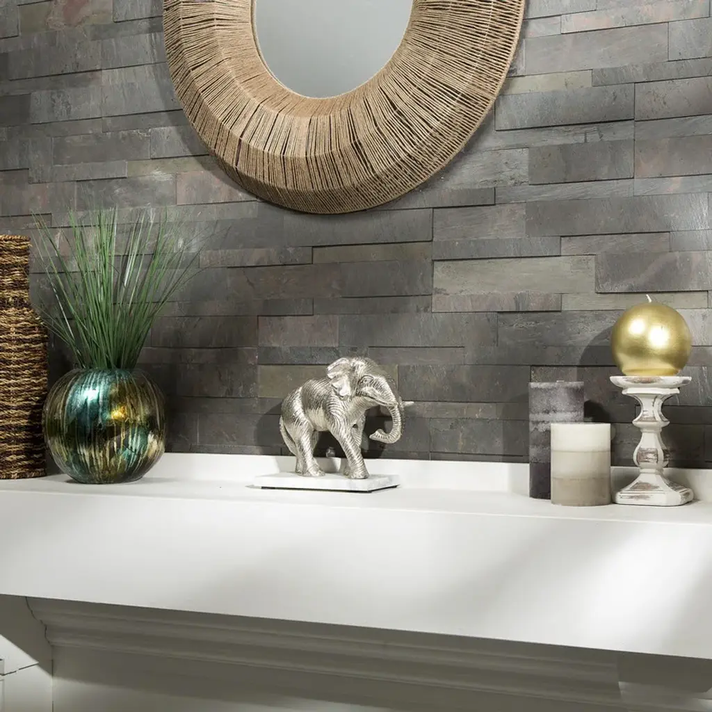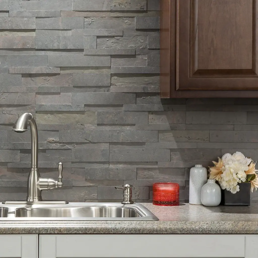 Add a touch of natural elegance to your kitchen with Aspect Peel and Stick Raised Stone Overlay Kitchen Backsplash Panel. Made of real stone layers, engineered bonding resin, fiberglass, and an adhesive base, this 1/4" thick mosaic tile backsplash offers a flexible, lightweight and affordable option. The Indian artisan craftsmen hand quarry, thinly slice, and assemble these ledgestone backsplash tiles, giving each panel its unique character. With easy peel and stick installation, this kitchen backsplash panel requires no grout or mortar, and no contractor is necessary. Available in earth-tone options, Aspect Stone complements today's decor, furniture, and appliance trends.Features: