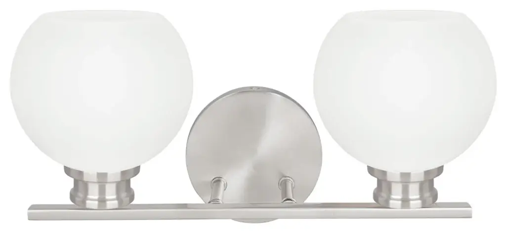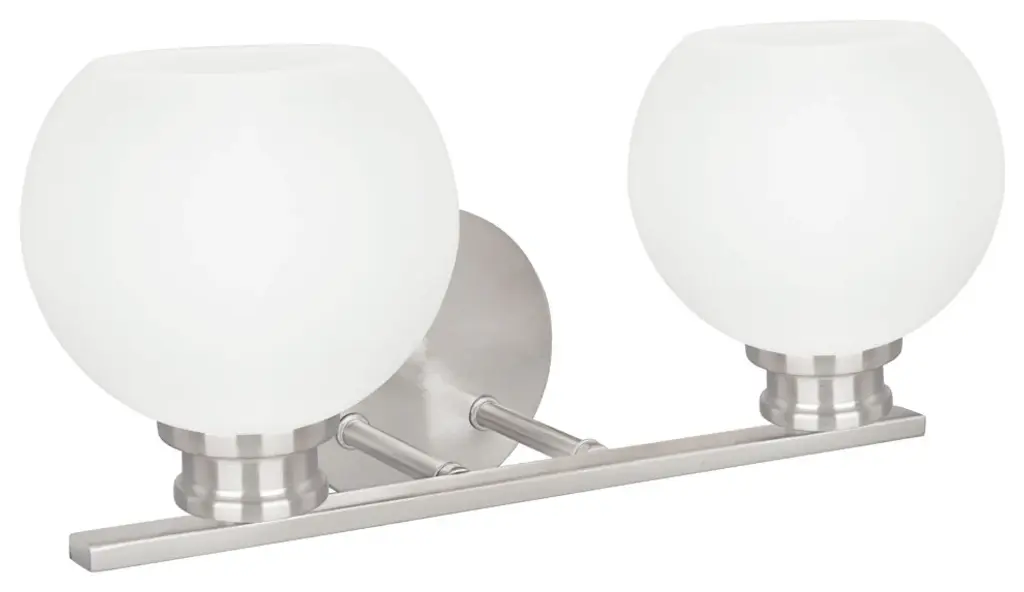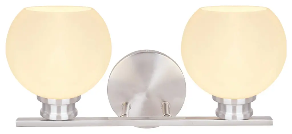 Aspen Creative is dedicated to offering a wide assortment of attractive and well-priced portable lamps, kitchen pendants, vanity wall fixtures, outdoor lighting fixtures, lamp shades, and lamp accessories. We have in-house designers that follow current trends and develop cool new products to meet those trends.Product Detail:• 2 Light bathroom lighting fixture in brushed nickel with opal glass shade• Fixture Dimensions: 7-1/4" Deep x 15" Wide x 8" Height• Requires 2 - 60 watt medium Base (not included)• UL listed for bathroom wall installation above the mirror and vanity cabinet as well as powder rooms and make up rooms