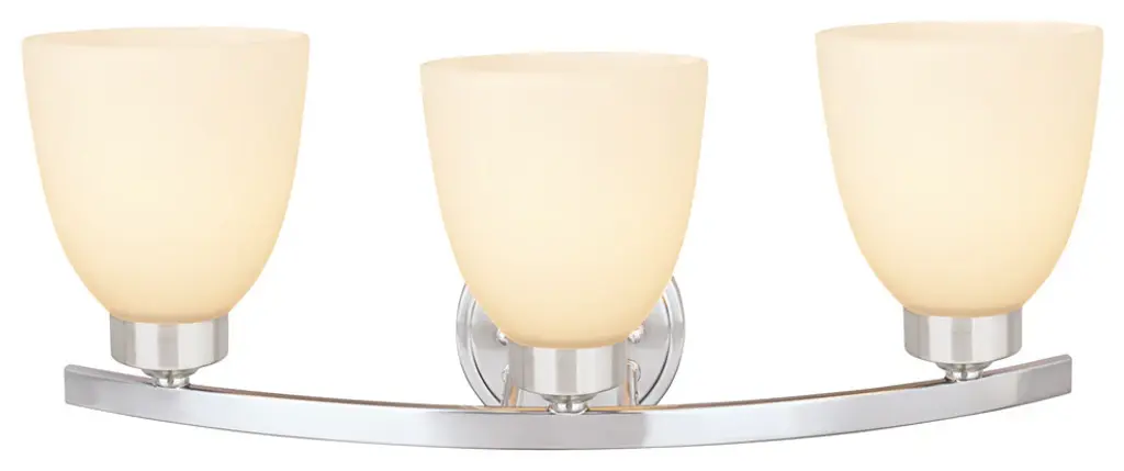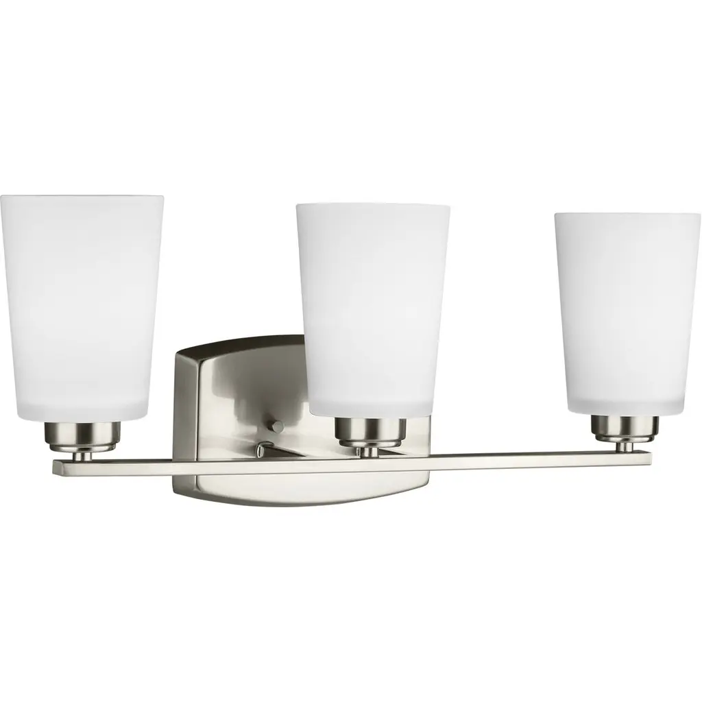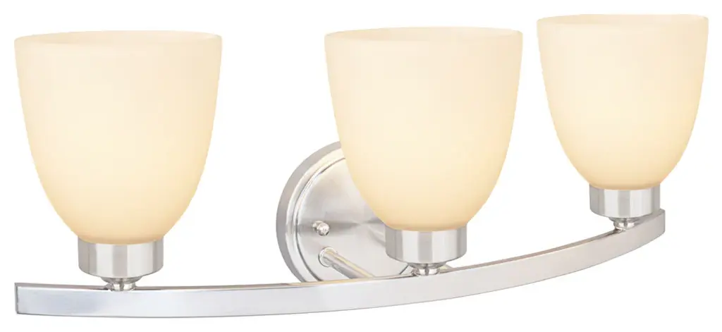 Aspen Creative is dedicated to offering a wide assortment of attractive and well-priced portable lamps, kitchen pendants, vanity wall fixtures, outdoor lighting fixtures, lamp shades, and lamp accessories. We have in-house designers that follow current trends and develop cool new products to meet those trends.Product Detail:• 3 Light bathroom lighting fixture in satin nickel with frosted glass shade• Fixture Dimensions: 7-1/2" Deep x 21" Wide x 7-1/2" Height• Requires 3 - 60 watt medium Base (not included)• UL listed for bathroom wall installation above the mirror and vanity cabinet as well as powder rooms and make up rooms