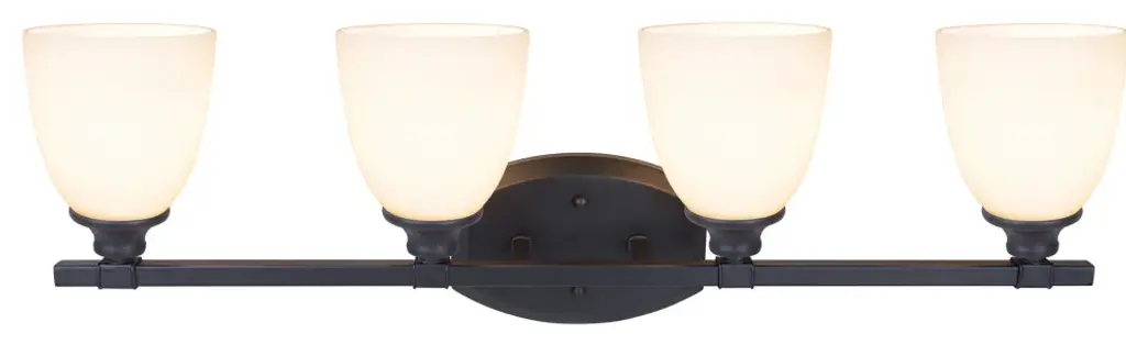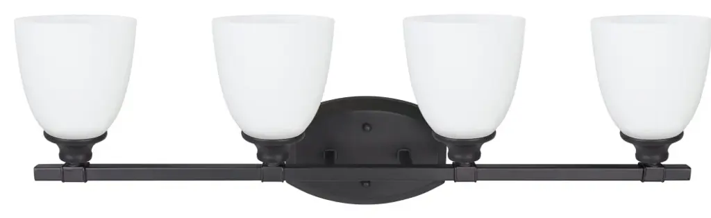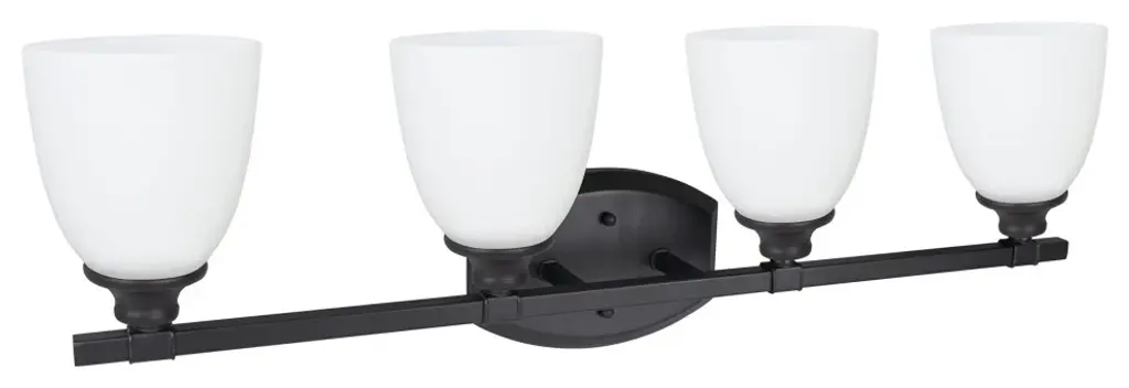 Aspen Creative is dedicated to offering a wide assortment of attractive and well-priced portable lamps, kitchen pendants, vanity wall fixtures, outdoor lighting fixtures, lamp shades, and lamp accessories. We have in-house designers that follow current trends and develop cool new products to meet those trends.Product Detail:• 4 Light bathroom lighting fixture in oil rubbed bronze with frosted glass shade• Fixture Dimensions: 6-1/2" Deep x 30-3/4" Wide x 9-3/4" Height• Requires 4 - 60 watt medium Base (not included)• UL listed for bathroom wall installation above the mirror and vanity cabinet as well as powder rooms and make up rooms
