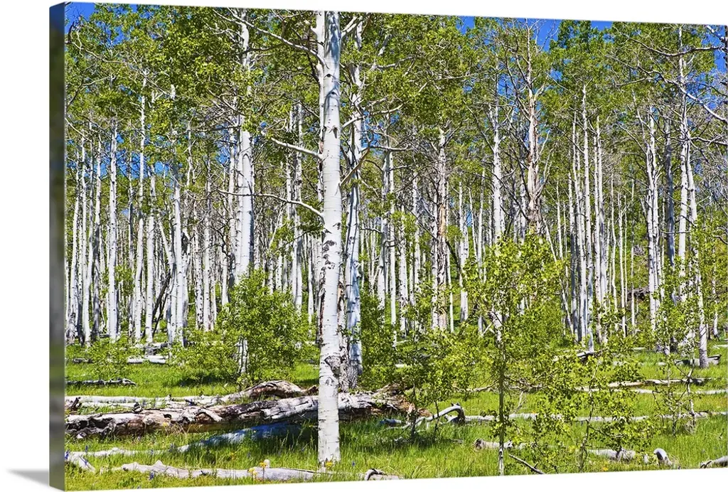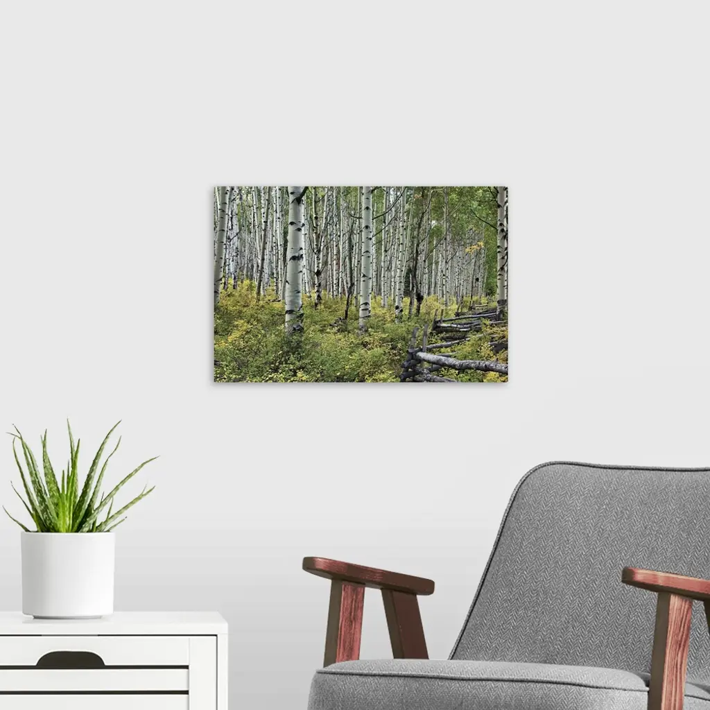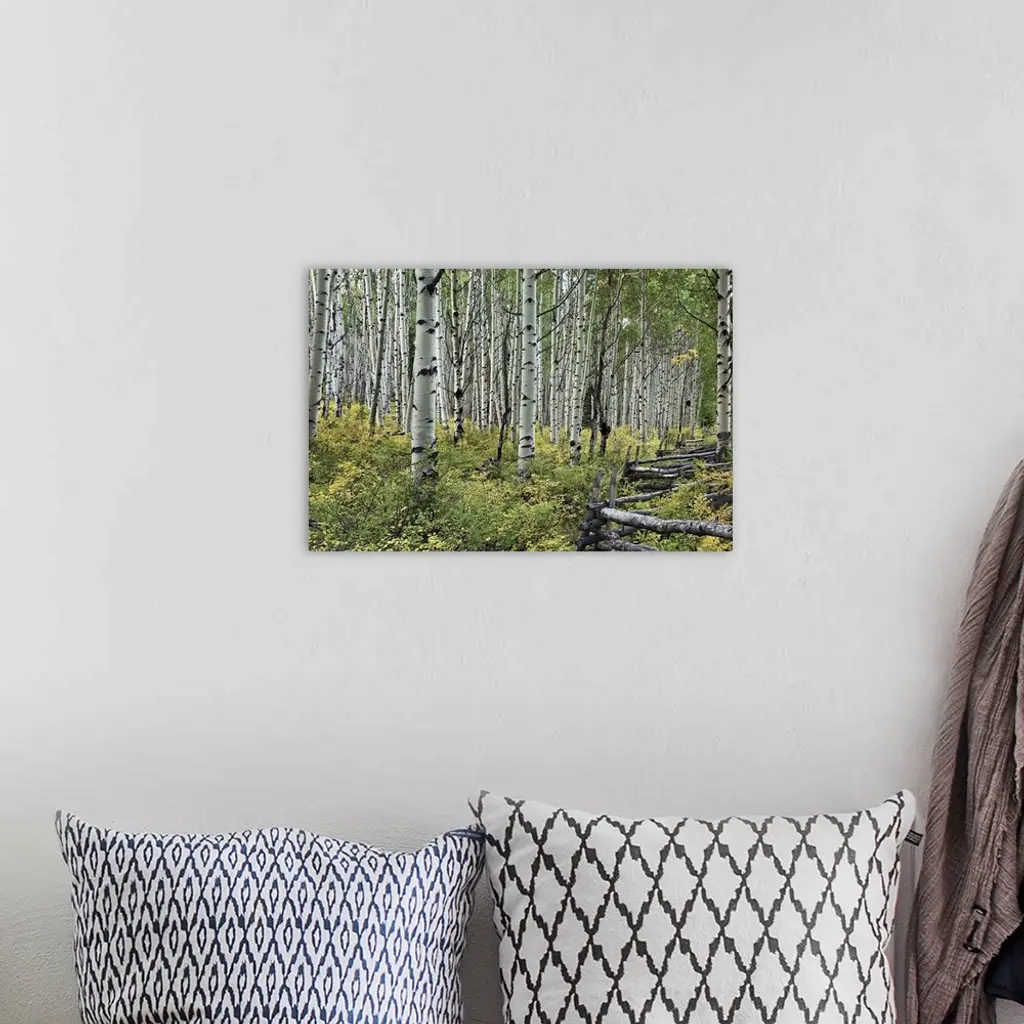 Grove of aspen trees in a forest with a hand build fence cutting through the bottom brush.