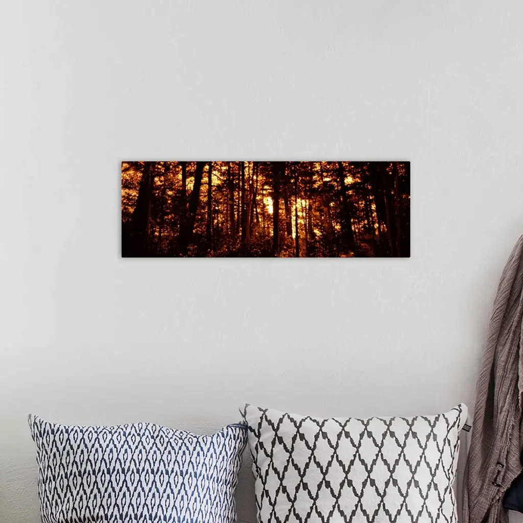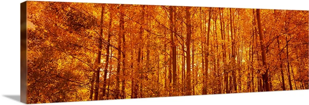 Panoramic photograph on a giant canvas, of a dense forest of silhouetted aspen trees in front of a golden sunrise, in Colorado.